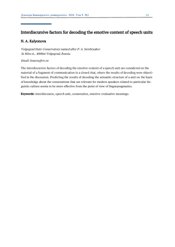 Рассмотрены интердискурсивные факторы декодирования эмотивного содержания речевой единицы на материале фрагмента коммуникации в закрытом чате, где в обсуждении были объективированы результаты декодирования. Прогнозирование результатов декодирования смысловой структуры единицы на основе знаний об актуальных для современных носителей лингвокультуры коннотациях представляется более эффективным с точки зрения лингвопрагматики.