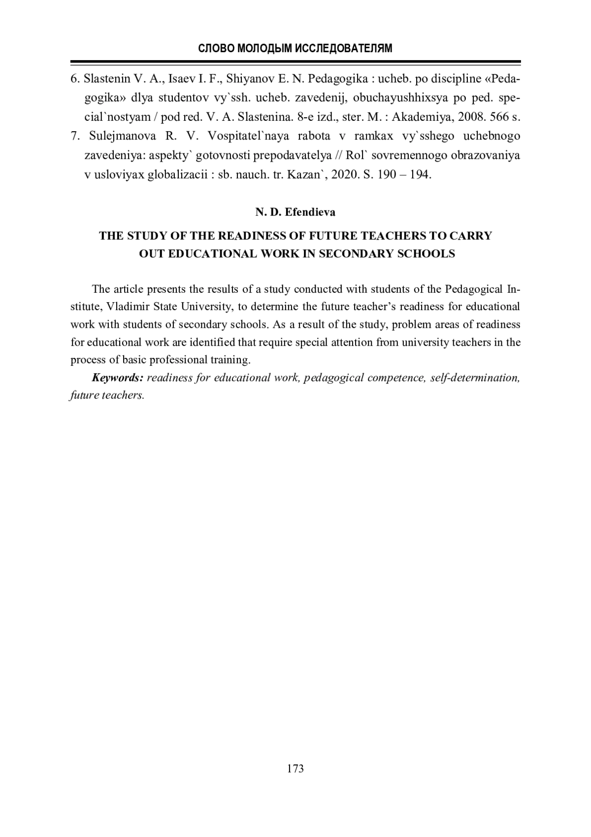 4. Новикова Е. С. Воспитывающая среда педагогического вуза как средство формирования профессиональной компетентности будущего учителя : автореф. дис. ... канд. пед. наук : 5.8.7. Волгоград, 2023. 28 с.