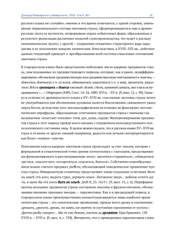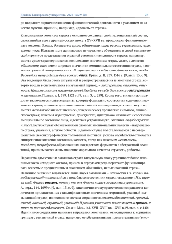 Статья посвящена анализу семантики эмотивных единиц со значением страха в русском языке XV-XVII вв. Установлено, что семантическое развитие этих единиц определялось действием ряда закономерностей: 1) синкретичное выражение пограничных значений, в частности статального и квалификативного, статального и каузативного и т. д.; 2) дифференцированное обозначение различных аспектов эмоций (степени интенсивности, длительности, внешнего выражения); 3) образное описание эмоций с помощью моделей метафорического и метонимического переноса типа «эмоция - материальный предмет», «эмоция - живое существо» и т. п.