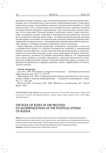 В статье рассматривается влияние элит на процесс модернизации политической системы России. Автор анализирует, как внутренние и внешние факторы, такие как экономические кризисы, социальные движения и международные отношения, влияют на действия элит и их способность к адаптации. Особое внимание уделяется взаимодействию различных элитных групп, их интересам и конфликтам, а также тому, как эти взаимодействия могут как способствовать, так и препятствовать процессу модернизации.