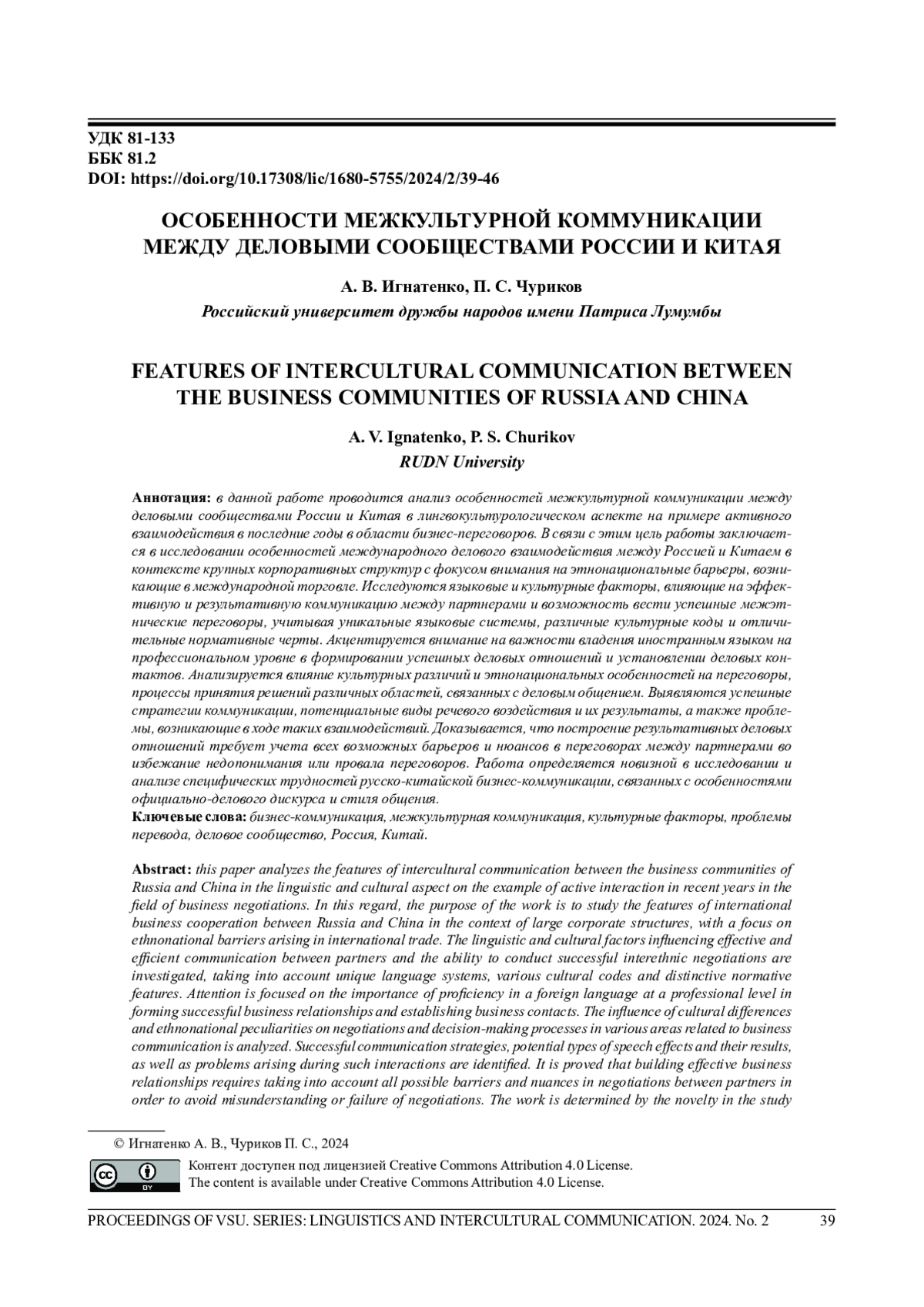 В данной работе проводится анализ особенностей межкультурной коммуникации между деловыми сообществами России и Китая в лингвокультурологическом аспекте на примере активного взаимодействия в последние годы в области бизнес-переговоров. В связи с этим цель работы заключается в исследовании особенностей международного делового взаимодействия между Россией и Китаем в контексте крупных корпоративных структур с фокусом внимания на этнонациональные барьеры, возникающие в международной торговле. Исследуются языковые и культурные факторы, влияющие на эффективную и результативную коммуникацию между партнерами и возможность вести успешные межэтнические переговоры, учитывая уникальные языковые системы, различные культурные коды и отличительные нормативные черты. Акцентируется внимание на важности владения иностранным языком на профессиональном уровне в формировании успешных деловых отношений и установлении деловых контактов. Анализируется влияние культурных различий и этнонациональных особенностей на переговоры, процессы принятия решений различных областей, связанных с деловым общением. Выявляются успешные стратегии коммуникации, потенциальные виды речевого воздействия и их результаты, а также проблемы, возникающие в ходе таких взаимодействий. Доказывается, что построение результативных деловых отношений требует учета всех возможных барьеров и нюансов в переговорах между партнерами во избежание недопонимания или провала переговоров. Работа определяется новизной в исследовании и анализе специфических трудностей русско-китайской бизнес-коммуникации, связанных с особенностями официально-делового дискурса и стиля общения.