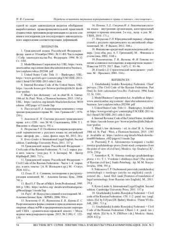 Статья имеет целью анализ способов передачи семантики терминов корпоративного права «слияние», «поглощение» и «присоединение» при переводе на английский язык. Материалом исследования послужили тексты кодексов, законов и иных нормативно-правовых актов в области корпоративного права РФ и США, учебники, учебные пособия и статьи по корпоративному праву, а также словарные статьи одноязычных и двуязычных юридических словарей. Результаты сравнительно-сопоставительного исследования показали, что правовой институт реорганизации юридического лица, известный корпоративному и налоговому праву США, существенным образом отличается от института реорганизации в рамках корпоративного права РФ. Перевод терминов «слияние» и «присоединение», обозначающих предусмотренные российским законодательством формы реорганизации, вызывает наибольшие сложности в связи с наблюдаемым сегодня семантическим сдвигом в понимании английских терминов «merger», «acquisition» и «consolidation» ввиду закрепившегося на практике варианта перевода наименования сделок по передаче корпоративного контроля «mergers and acquisitions» (M&A) как «сделки слияния и поглощения». При переводе терминов «слияние» и «присоединение», обозначающих предусмотренные российским законодательством формы реорганизации, специалистами проводятся параллели с известной американскому праву реорганизацией типа «A reorganization», объединяющей «merger or consolidation». Однако различия в объеме правовых последствий позволяют провести разграничение между семантическим наполнением термина «merger» в широком смысле, объединяющего присоединение и слияние, и термина «merger» в узком смысле, эквивалентного термину «присоединение», а также обособленно рассматривать термин «consolidation» как эквивалент термина «слияние».
