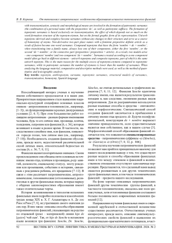 Статья посвящена проблеме создания испанских топонимических фамилий. В ней излагаются результаты исследования, цель которого заключается в выявлении особенностей образования и описании структурных моделей оттопонимных семейных имен. Сравнительно-сопоставительный анализ оттопонимных фамилий с этимоном-топонимом, его словообразовательными типами, а также с патронимическими фамилиями позволили сделать выводы об общих и частных закономерностях образования фамильных имен в испанском языке. К числу общих закономерностей относится трансонимизация онимов - личных имен в патронимических фамилиях и топонимов в оттопонимных фамилиях. Наряду с трансонимизацией в образовании патронимических фамилий задействованы синтаксические и морфологические средства (сочетание личного имени с предлогом de, а также патронимические суффиксы). Образование оттопонимных фамилий базируется исключительно на трансонимизации, действие которой зависит не столько от словообразовательной структуры топонима-этимона, сколько от формально-графической формы его представления. Топонимы-универбы (производные и сложные) становятся фамилиями без каких-либо изменений своей структуры и служат источником омонимии онимов. Непроизводные двусоставные топонимы с определенным артиклем женского рода в результате фузии становятся однословными фамилиями. Составные топонимы, имеющие форму nombre + de + nombre, при переходе в фамильное имя всегда утрачивают один из своих компонентов, либо первый nombre, либо второй de + nombre, либо связочную часть (предлог/ предлог + артикль), в результате возникают две модели - однокомпонентная nombre и двухкомпонентная de + nombre. Фамилии, созданные по однокомпонентной модели, зачастую восходят к разным этимонам - топонимам-универбам и составным топонимам, частью которых является тот же самый топоним-универб. Это является главной причиной многократного превышения топонимов-этимонов по сравнению с оттопонимными фамилиями, тогда как в патронимических фамилиях количество этимонов меньше количества фамилий. При анализе языкового материала применялись сравнительно-сопоставительный и описательный методы, а также метод количественного и лексикографического анализа.