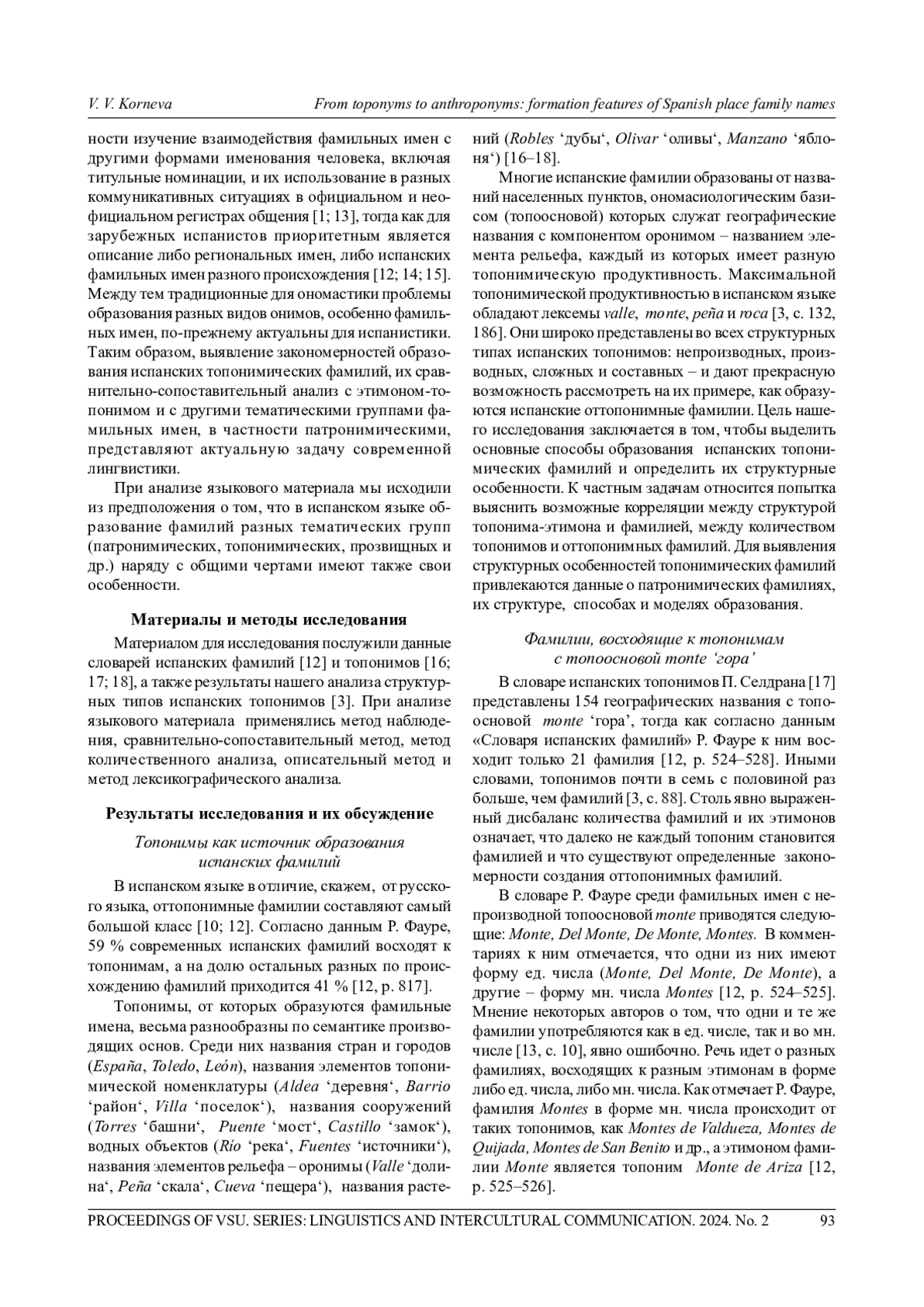 Многие испанские фамилии образованы от названий населенных пунктов, ономасиологическим базисом (топоосновой) которых служат географические названия с компонентом оронимом – названием элемента рельефа, каждый из которых имеет разную топонимическую продуктивность. Максимальной топонимической продуктивностью в испанском языке обладают лексемы valle, monte, peña и roca [3, с. 132, 186]. Они широко представлены во всех структурных типах испанских топонимов: непроизводных, производных, сложных и составных – и дают прекрасную возможность рассмотреть на их примере, как образуются испанские оттопонимные фамилии. Цель нашего исследования заключается в том, чтобы выделить основные способы образования испанских топонимических фамилий и определить их структурные особенности.