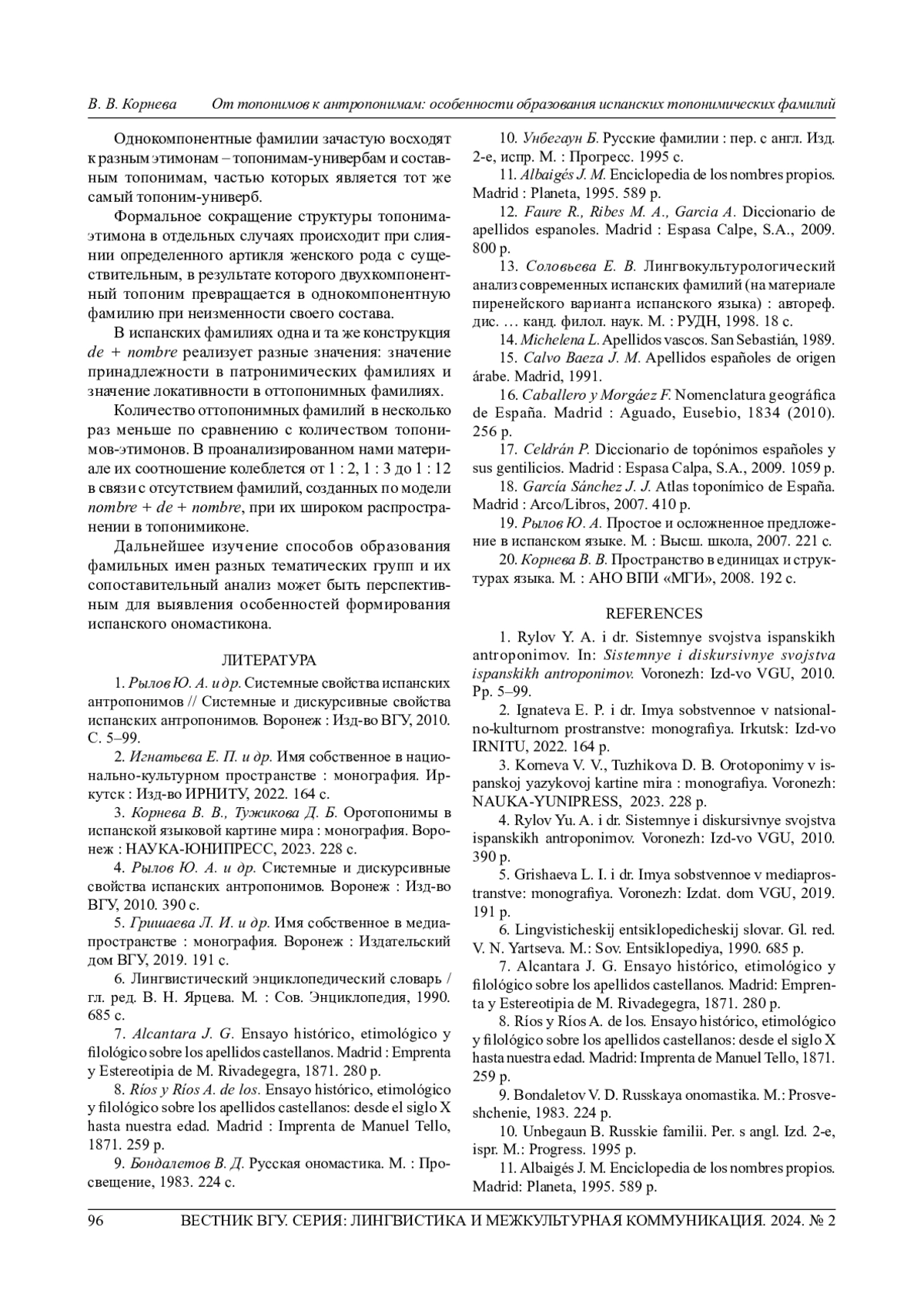 1. Рылов Ю. А. и др. Системные свойства испанских антропонимов // Системные и дискурсивные свойства испанских антропонимов. Воронеж: Изд-во ВГУ, 2010. С. 5-99. EDN: RUEYQN