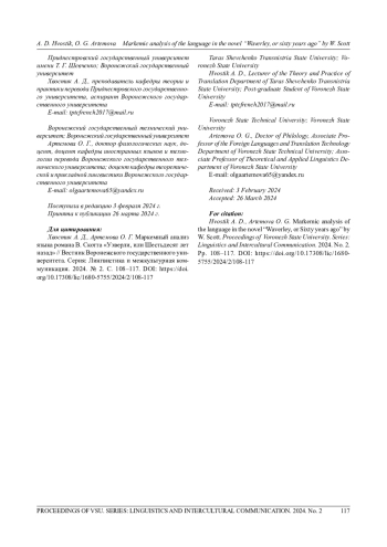 Цель данной статьи - формализованный содержательный анализ языка исторического романа «Уэверли» (1814) сэра Вальтера Скотта (1771-1832). Описанное исследование выполнено в русле маркемологии - лингвистического направления, предлагающего выделить в массиве текстов маркемы, особый вид ключевых слов на основе объективного показателя информативности лексемы -Индекса Текстуальной Маркированности (ИнТеМ). Проведенный маркемный анализ языка романа позволил выявить доминантную и вице-доминантную маркемы: disappointment ‘разочарование ’ и consideration ‘размышление ’ соответственно. В результате стратификации маркем установлены маркемное ядро в количестве 15 маркем и маркемная периферия - 35 маркем. Выявлены 10 групп равновесных, а следовательно, равнозначных маркем. В результате семантической классификации маркемы романа «Уэверли» распределены в семь семантических блоков: фундаментальные маркемы, межличностные маркемы, ментально-перцептивные маркемы, эмоциональные маркемы, качественные маркемы, социальные маркемы, морально-этические маркемы. Установлены три ключевых семантических блока: ментально-перцептивные маркемы, эмоциональные маркемы, маркемы, выражающие межличностные отношения. Среди ядерных маркем большинство принадлежит маркемам, описывающим ментально-перцептивные процессы. Маркемный анализ языка романа показывает, что автор придает особенное значение различным аспектам межличностного общения и взаимодействия, способности прийти к договоренности и примирению. Важной представляется необходимость глубокого размышления, рассмотрения всех аспектов ситуации, чем герои романа зачастую пренебрегают. Особо значимым для автора является обращение персонажей к собственному рассудку и сознанию как источнику мыслительной деятельности. В романе главенствуют негативные эмоции - разочарование и чувство стыда, смущения. Кроме того, акцент делается на необходимости осмысления поступков, комплексной рефлексии и, как следствие, исправлении ошибок.