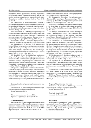 20. Зюбина И. А. Проявление доминирования в формировании отношения путем оценивания: лингвокультурные особенности // Славянская культура: истоки, традиции, взаимодействие. ХХIII Кирилло-Мефодиевские чтения: материалы Междунар. науч.-практ. конф. М.: Гос. ин-т русского языка им. А. С. Пушкина, 2022. С. 489-494. EDN: LCLKRU