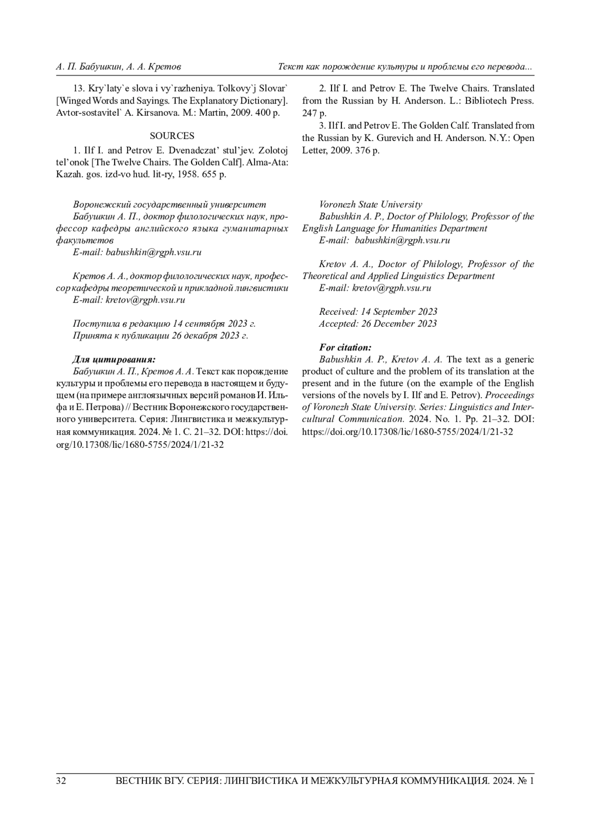 16. Ilf I. and Petrov E. The Golden Calf / translated from the Russian by K. Gurevich and H. Anderson. N. Y.: Open Letter, 2009. 376 p.