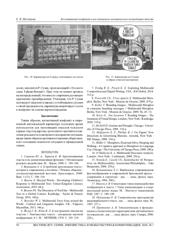 В статье описываются возможные подходы к понятию и типологии поликодовых текстов в современной лингвистике. Обсуждаются сложности, возникающие при работе с поликодовым текстом разных типов. Рассматриваются принципиальные отличия поликодовых текстов, которые должны определять методики работы с ними. Предлагается выделять жанры поликодовых текстов с преобладанием художественного эффекта, политического и пропагандистского эффекта, рекламного эффекта, эффекта личного пространства. Эти типы могут предполагать дальнейшую группировку в зависимости от цели создания, расширенных функций, прагматического эффекта, способов производства и распространения, контекста, географии и других факторов. В качестве одного из методологических решений при анализе поликодового текста мы предлагаем выделение когнитивного конфликта, когда художественный эффект получается за счет столкновения двух систем и определенной неожиданности нового продукта. Способы проявления когнитивного конфликта в поликодовом тексте зависят от жанровых характеристик, функций текста, его прагматики. В данной статье описаны три типа когнитивного конфликта в поликодовом тексте. Это конфликт вербального и графического компонента, конфликт на языковой игре, конфликт, создаваемый за счет карикатурной ситуации и реального положения дел. Данные положения проиллюстрированы на примере карикатуры на Барака Обаму и Риши Сунака. В качестве основных методов в исследовании используются лингвокультурный, когнитивно-дискурсивный методы, дополненные методиками структурной семантики. Результаты исследования вносят вклад в разработку проблем политической метафорологии, прагматики текста. Некоторые результаты и выводы будут полезны ученым, занимающимся проблемами культурологии и лингвокультурологии, политологии.