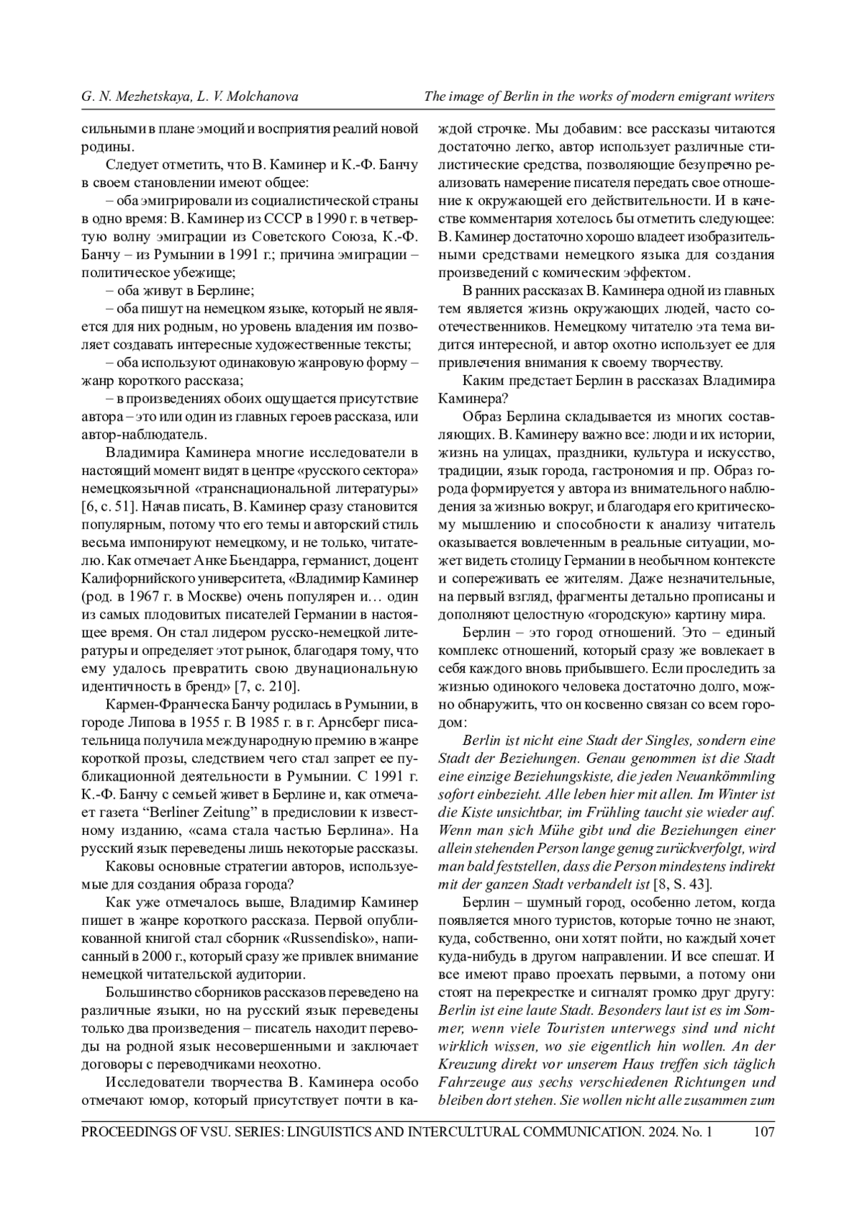 Предлагаемое исследование посвящено рассмотрению образа Берлина в немецкой художественной литературе писателей, эмигрировавших в Германию в 90-е гг. XX в. Цель данной статьи - рассмотреть, как формируется художественный образ города Берлина в произведениях двух писателей-эмигрантов: В. Каминера и К.-Ф. Банчу, выявить, как авторы определяют основные параметры понятия «город Берлин», а также раскрывают систему оппозиций, которые организуют комплексный образ города Берлина, таких как город как взаимодействие и противостояние культур Восточной и Западной Европы, их национальная специфика, проявляющаяся во всех сферах жизни и деятельности человека, а особенно иммигрантов, особенности столичной жизни, жители Берлина, которые неотделимы от города и формируют его образ, а берлинцы - это и рожденные в этом городе, и эмигранты, и беженцы. В фокусе исследования находятся и языковые средства, которые выбирают авторы для воспроизведения своих эмоциональных ассоциаций и впечатлений. Некоторые художественные образы Берлина приобретают иронические коннотации. Результаты исследования показали, что образ Берлина обоих авторов складывается из одинаковых составляющих. В них отражается специфика конкретного города, его статус, история и только ему присущие черты. Берлин В. Каминера и К.-Ф. Банчу - это город, который является отражением не только узкого мирка каждого индивида, но и отражением национальной картины мира. При этом каждый предлагает свое видение объекта и использует различные языковые средства, приемы и трансформации.