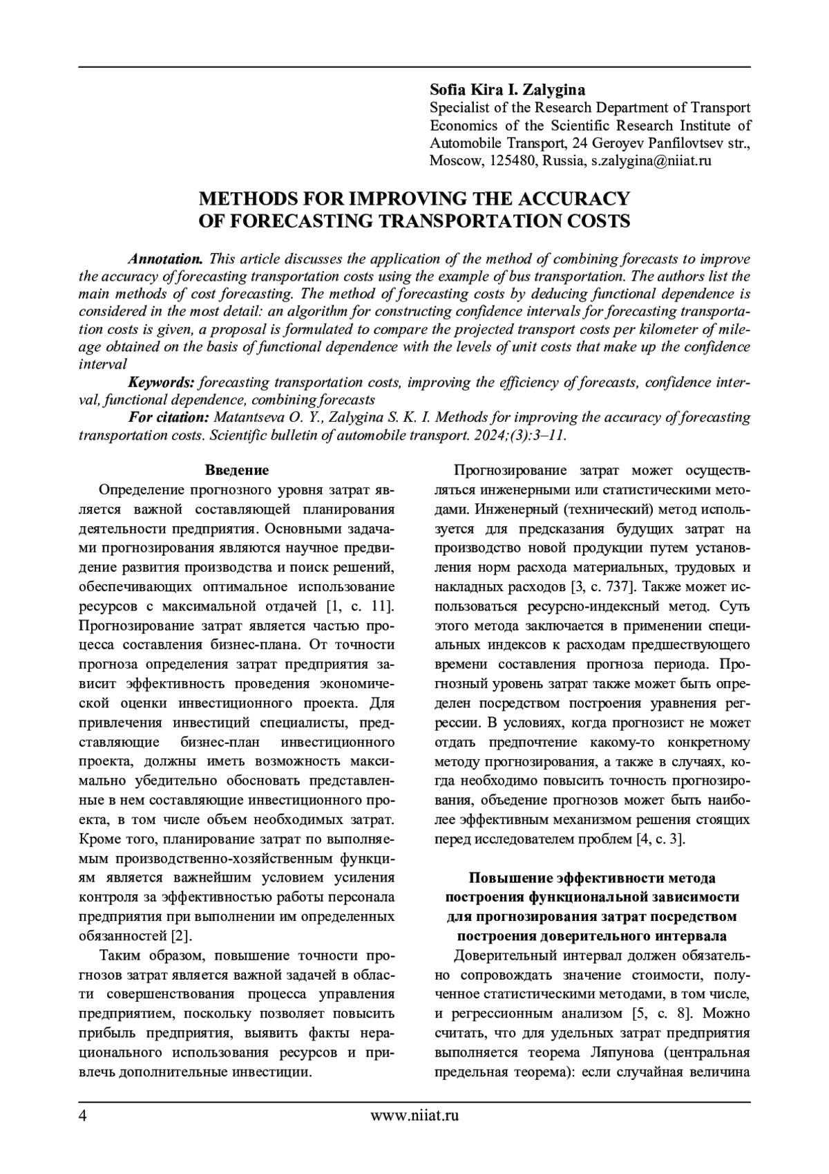 В данной статье рассматривается применение метода объединения прогнозов для повышения точности прогноза затрат на осуществление перевозок на примере перевозок автобусным транспортом. Авторами перечисляются основные методы прогнозирования затрат. Наиболее подробно рассматривается метод прогнозирования затрат посредством выведения функциональной зависимости: приводится алгоритм построения доверительных интервалов для прогнозирования затрат на осуществление перевозок. Формулируется предложение производить сопоставление полученных на основе функциональной зависимости прогнозных затрат транспорта на один километр пробега с уровнями удельных затрат, составляющими доверительный интервал