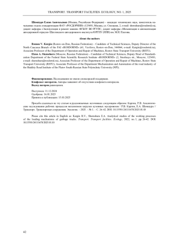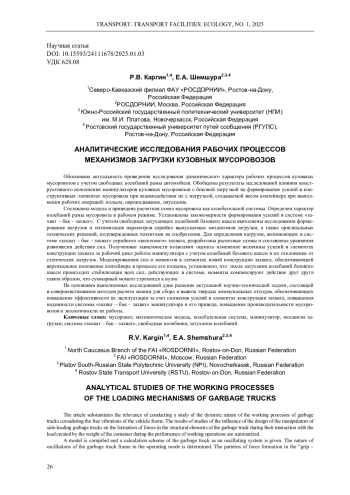 Обоснована актуальность проведения исследования динамического характера рабочих процессов кузовных мусоровозов с учетом свободных колебаний рамы автомобиля. Обобщены результаты исследований влияния конструктивного исполнения манипуляторов кузовных мусоровозов с боковой загрузкой на формирование усилий в конструктивных элементах мусоровоза при взаимодействии их с нагрузкой, создаваемой весом контейнера при выполнении рабочих операций: подъем, опрокидывание, опускание. Составлена модель и приведена расчетная схема мусоровоза как колебательной системы. Определен характер колебаний рамы мусоровоза в рабочем режиме. Установлены закономерности формирования усилий в системе «захват - бак - захват». С учетом свободных затухающих колебаний базового шасси выполнены исследования формирования нагрузок и оптимизация параметров серийно выпускаемых механизмов загрузки, а также оригинальных технических решений, подтвержденных патентами на изобретения. Для определения нагрузок, возникающих в системе «захват - бак - захват» серийного «вилочного» захвата, разработаны расчетные схемы и составлены уравнения равновесия действия сил. Полученные зависимости позволяют оценить изменение величины усилий в элементах конструкции захвата за рабочий цикл работы манипулятора с учетом колебаний базового шасси и их отклонение от статических нагрузок. Моделированием сил и моментов в элементах новой конструкции захвата, обеспечивающей вертикальное положение контейнера в процессе его подъема, установлено, что после затухания колебаний базового шасси происходит стабилизация всех сил, действующих в системе, моменты компенсируют действие друг друга таким образом, что суммарный момент стремится к нулю. На основании выполненных исследований дано решение актуальной научно-технической задачи, состоящей в совершенствовании методов расчета машин для сбора и вывоза твердых коммунальных отходов, обеспечивающих повышение эффективности их эксплуатации за счет снижения усилий в элементах конструкции захвата, повышения надежности системы «захват - бак - захват» манипулятора и его привода, повышения производительности мусоровозов и экологичности их работы.