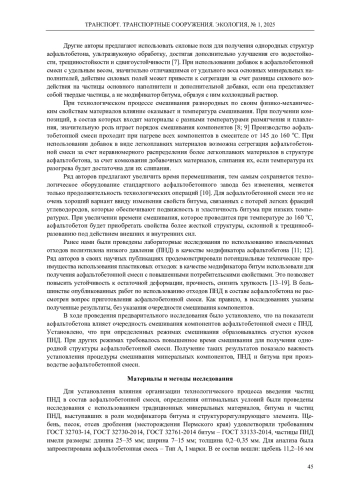 Асфальтобетоны представляют собой композиционный материал, состоящий из минеральных материалов различного гранулометрического состава и битума. Для регулирования физико-механических и эксплуатационных показателей асфальтобетонов в состав асфальтобетонной смеси вводят дополнительные компоненты. Использование в составе асфальтобетонов различных добавок требует уточнения классической схемы производства асфальтобетонной смеси, определения последовательности введения добавки и технологических режимов ее производства. В большинстве опубликованных работ по использованию структурорегулирующих добавок в составе асфальтобетона не рассматриваются вопросы технологии производства асфальтобетонной смеси. Как правило, в исследованиях указаны полученные результаты без упоминания технологических режимов, в том числе очередности смешивания компонентов. На примере использования измельченных отходов полиэтилена низкого давления в качестве структурорегулирующей добавки проведено исследование по установлению характера влияния на физико-механические показатели асфальтобетонов процесса смешивания. Анализ полученных показателей асфальтобетонных образцов с частицами полиэтилена низкого давления и вычисленные коэффициенты вариации и осцилляции показали, что на качество асфальтобетонной смеси процесс смешивания оказывает значительное влияние. Установлено, что физико-механические показатели образцов асфальтобетона могут варьироваться в пределах 6-15 %, что указывает на формирование существенной неоднородности асфальтобетонной смеси и, как следствие, асфальтобетон будет иметь значительную неоднородность своей структуры при промышленном выпуске. Установлено, что для обеспечения высокой степени композиционной однородности структуры асфальтобетона при использовании в его составе измельченного полиэтилена низкого давления необходимо его вводить в состав асфальтобетонной смеси на этапе смешивания каменных материалов. Битум добавляется в смесь после перемешивания каменных материалов с частицами полиэтилена низкого давления. Такой порядок смешивания обеспечивает минимальное время приготовления асфальтобетонной смеси, снижение потребления энергетических ресурсов, обеспечение эффективности технологии утилизации тары из полиэтилена низкого давления. На примере использования полиэтилена низкого давления в качестве структурорегулируюшей добавки показано влияние процесса смешивания в технологии производства асфальтобетонных смесей на физико-механические свойства асфальтобетона.