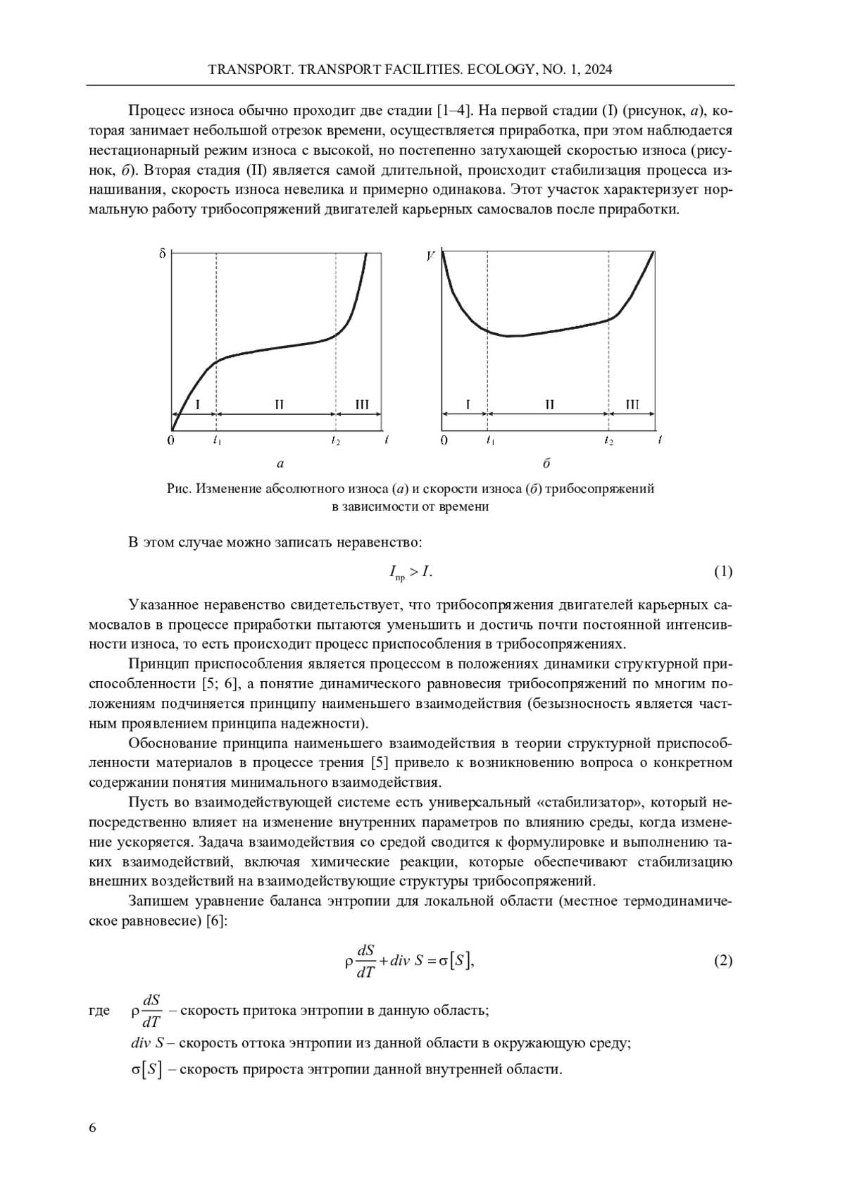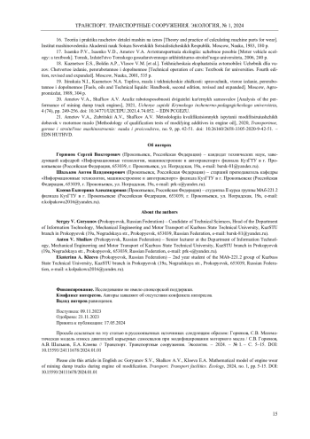 Предложена математическая модель износа двигателей карьерных самосвалов при модифицировании моторного масла. При этом работоспособность каждого элемента пары трения при модифицировании моторного масла увеличивается, а интенсивность работы отдельных элементов двигателя в процессе работы находится во временном интервале. Полученные выражения позволяют описать работоспособность пар трения двигателей карьерных самосвалов и дают полезную информацию о структурной перестройке в поверхностных слоях пар трения при модифицировании моторного масла двигателей карьерных самосвалов. Для оценки точности остаточного ресурса двигателей карьерных самосвалов было предложено определить среднее квадратическое отклонение диагностического параметра и, в зависимости от принятой доверительной вероятности, определить отклонения диагностического параметра от его первоначального теоретического значения. По значению остаточного ресурса двигателей путем сравнения его с сезонной наработкой необходимо принимать решение о своевременном проведении технического обслуживания или ремонта двигателей карьерных самосвалов. Также при рассмотрении поверхностного слоя в неоднородном физическом поле была получена математическая модель износа пар трения двигателей карьерных самосвалов. Эффективность разработок триботехнических материалов прежде всего определяется их свойствами и промышленным применением. Важная роль при этом принадлежит триботехническим характеристикам присадок в моторное масло, которые выполняют функции параметра оптимизации при разработке технологий и основного критерия в процессе выбора материалов для пар трения двигателей карьерных самосвалов. Они отражают состояние пар трения двигателей карьерных самосвалов, элементами которых являются контактирующие и смазочные материалы.