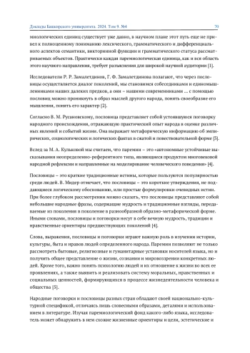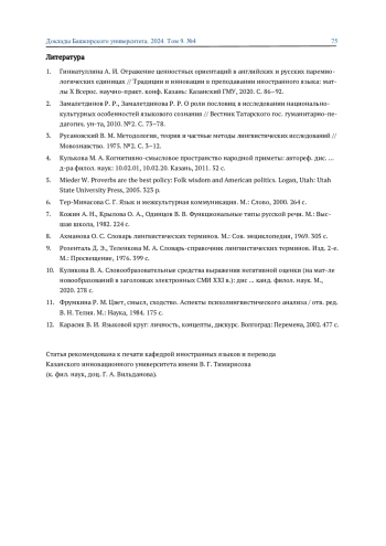 1. Гиниатуллина А. И. Отражение ценностных ориентаций в английских и русских паремиологических единицах // Традиции и инновации в преподавании иностранного языка: мат-лы X Всерос. научно-практ. конф. Казань: Казанский ГМУ, 2020. С. 86-92. EDN: DCGQTG