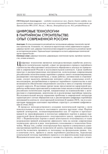 1. Ежов Д.А. 2024. Трансформация института политических партий в России в условиях цифровизации и виртуализации. - Социально-гуманитарные знания. № 10. С. 156-159. EDN: NSWZLP