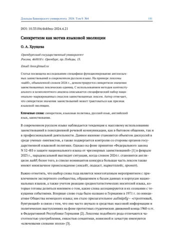 6. Хрущева О. А. Синкретизм значения заимствованного слова // Когнитивные исследования языка. 2024. Вып. 5(61): Когнитивные описания языка: концепции, методы, процедуры: мат-лы круглого стола, Москва, 31 окт. - 1 нояб. 2024 г. / гл. ред. вып. О. К. Ирисханова. Тамбов: изд. дом “Державинский”. С. 211-215. EDN: ZIDWLN