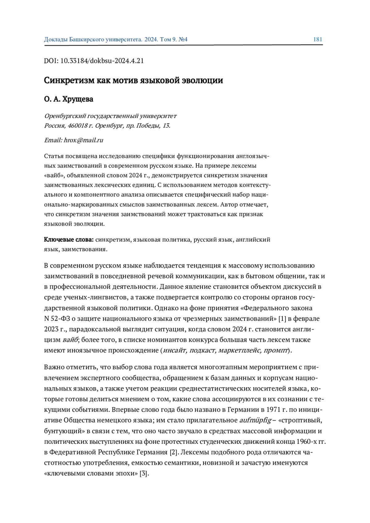Статья посвящена исследованию специфики функционирования англоязычных заимствований в современном русском языке. На примере лексемы «вайб», объявленной словом 2024 г., демонстрируется синкретизм значения заимствованных лексических единиц. С использованием методов контекстуального и компонентного анализа описывается специфический набор национально-маркированных смыслов заимствованных лексем. Автор отмечает, что синкретизм значения заимствований может трактоваться как признак языковой эволюции.