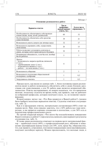 На основе прикладного социологического опроса студентов Березниковского филиала Пермского национального исследовательского политехнического университета в г. Березники Пермского края, втором по численности и социально-экономическому потенциалу городе Западного Урала (после краевого центра г. Перми), выясняется, чем для респондентов является работа (более 90% опрошенных работают) и что прежде всего им нравится в работе. Полученные результаты также показывают, какие качества помогают достигать профессиональных успехов. Ответы респондентов демонстрируют, чего они хотят достичь в работе, от кого/чего зависит успешное трудоустройство и на что они ориентируются при выборе профессии. Выясняется роль государства в трудоустройстве и как современная молодежь относится к безработице. Показаны наиболее привлекательные профессии, по мнению представителей молодого поколения, и отношение к перспективе профессионального роста. Результаты опроса могут быть использованы научно-педагогическими кадрами при подготовке (корректировке) рабочих программ, потенциальными работодателями, которые остро нуждаются в высокопрофессиональных кадрах и думают о долгосрочных перспективах развития своих производств. Мнения молодежи следует учитывать и властным структурам, разрабатывающим программы развития территории, в которых речь идет о сохранении трудовых ресурсов, повышении уровня и качества жизни.
