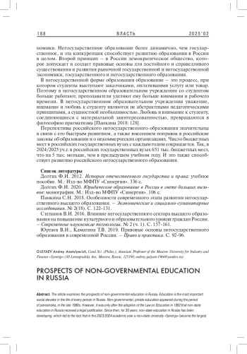 В статье рассматриваются перспективы негосударственного образования в России. Образование является важнейшим социальным лифтом в жизни каждого человека в России. Негосударственное, частное образование появилось в период перестройки, в конце 1980-х гг. Но лишь после принятия Закона об образовании в 1992 г. негосударственное образование в России получило правовое обоснование. С тех пор в течение 30 лет негосударственное образование в России развивается, что привело к тому, что в 2023/2024 уч./г. крупнейшим университетом России впервые стал негосударственный вуз - Университет «Синергия». В данном исследовании используется сравнительно-исторический и прогностический методы. Школьное образование в России формирует знания, умения и навыки обучающихся для сдачи основного и единого государственных экзаменов (ОГЭ и ЕГЭ). Негосударственное среднее профессиональное и высшее образование в России справляются с данной проблемой. Государственное и негосударственное образование в России имеют своих сторонников, свои возможности и перспективы. Их задача заключается в том, чтобы выявить свои возможности и перспективы и повысить эффективность всей системы образования в России.