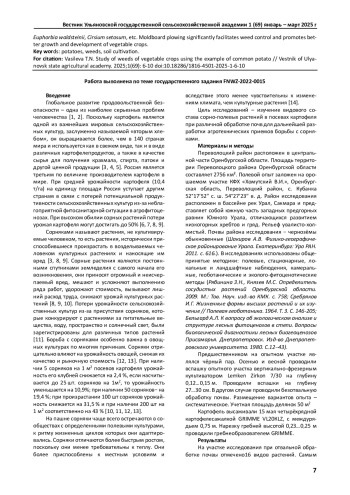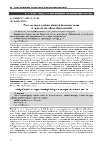 Целью исследовательской работы является изучение видового состава сорно-полевых растений в посевах картофеля при различной обработке почв для дальнейшей разработки агротехнических приемов борьбы с сорняками. Полевой опыт заложили на орошаемом участке в Оренбургской области. На участках исследования проводили сбор гербария. Идентификацию растений осуществляли с использованием «Определителя сосудистых растений Оренбургской области». При описании сорно-полевых растений провели геоботаническое и эколого-фитоценотическое описание по общепринятым методикам. На участке при отвальной обработке почвы насчитывается 16 видов растений, относящихся к следующим семействам: Asteraceae D., Chenopodiaceae Vent., Polygonaceae Juss., Amaranthaceae Juss., Роасеае B., Brassicaceae B., Euphorbiaceae Juss., Caryophyllaceae Juss., ConvolvulaceaeJuss. При безотвальной обработке почв на участке исследования насчитывается 33 вида растений, относящихся к семействам: Asteraceae D., Роасеае B., Polygonaceae Juss., Chenopodiaceae Vent., Amaranthaceae Juss., Brassicaceae B., Rubiaceae Juss., Euphorbiaceae Juss., Fabaceae Lindl., Caryophyllaceae Juss., Convolvulaceae Juss., Resedaceae Martinov. На участке исследования доминировали виды растений: Amaranthus retroflexus L., A. blitoides S. Watson, Conyza canadensis (L.) Crong, Sonchus arvensis L., Echinochloa oryzoides (Ard.) Fritsch и д. р., вредоносные космополитные многолетники, такие как: Convolvulus arvensis, Euphorbia waldsteinii, Cirsium setosum и т. д. Отвальная вспашка значительно облегчает борьбу с сорняками и способствует лучшему росту и развитию овощных культур.