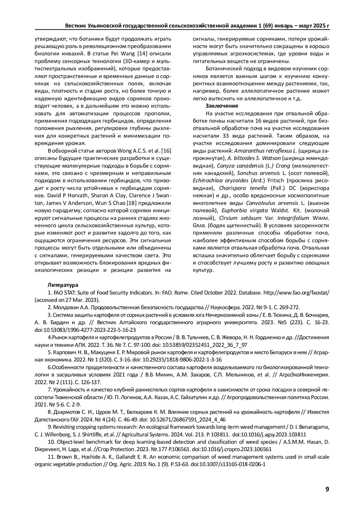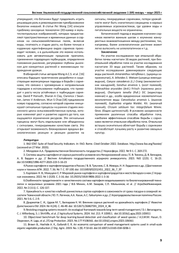 8. Дзармотов С. И., Цуров М. Т., Белхароев К. М. Влияние сорных растений на урожайность картофеля // Известия Дагестанского ГАУ. 2024. № 4 (24). С. 46-49. DOI: 10.52671/26867591_2024_4_46 EDN: NYICKW
