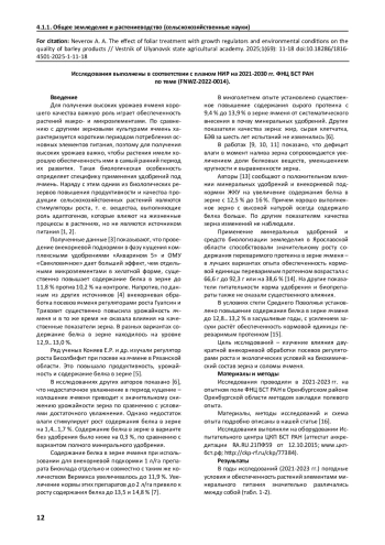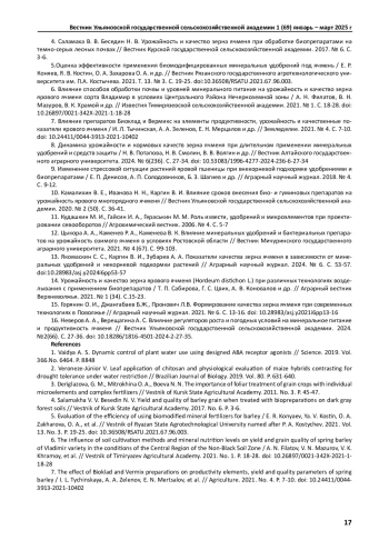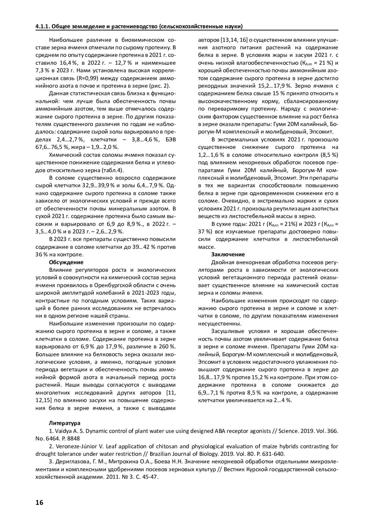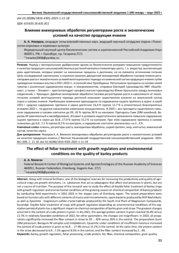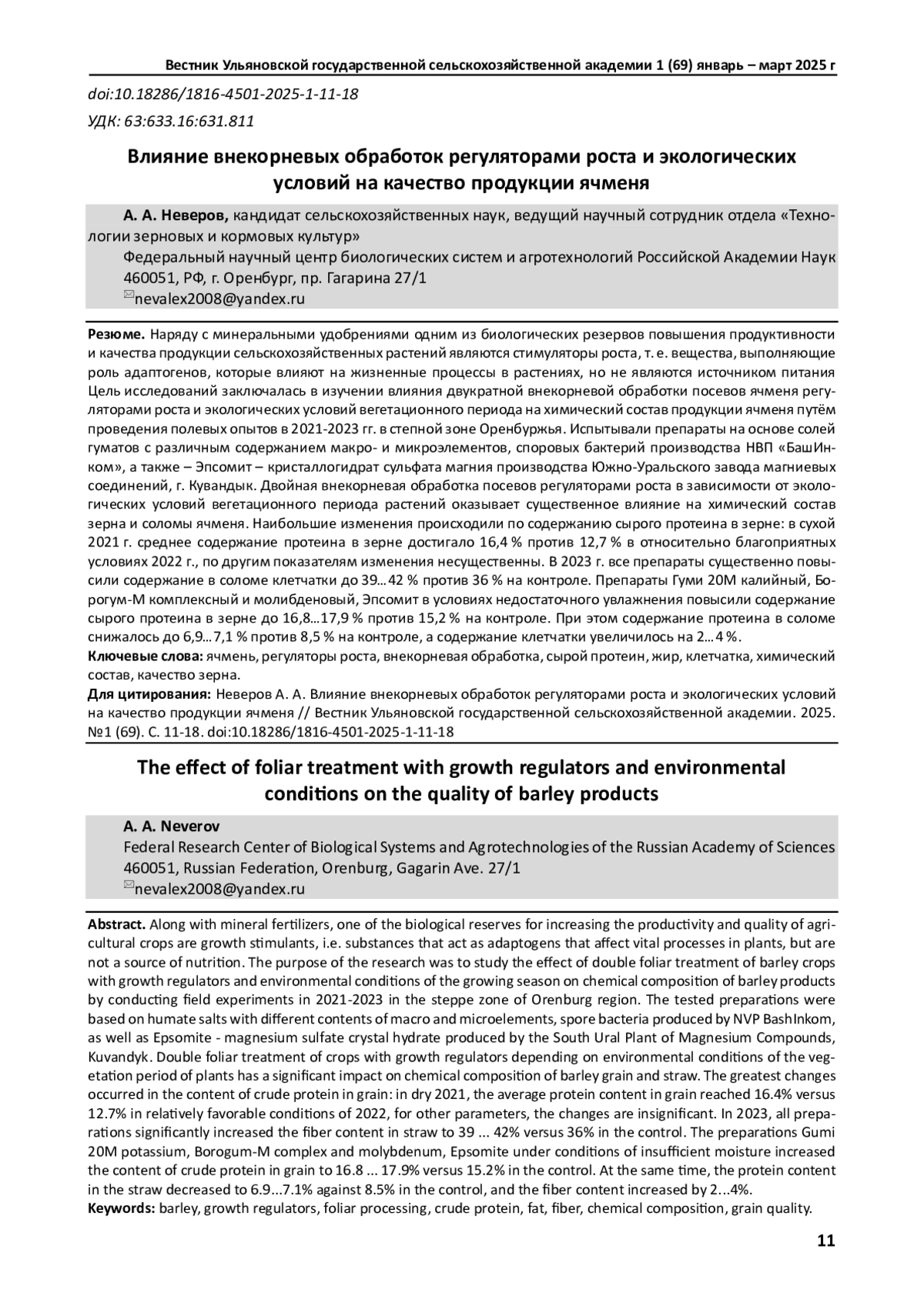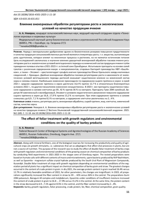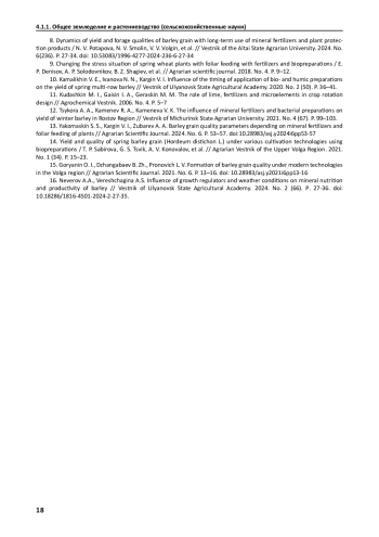 16. Неверов А. А., Верещагина А. С. Влияние регуляторов роста и погодных условий на минеральное питание и продуктивность ячменя // Вестник Ульяновской государственной сельскохозяйственной академии. 2024. №2(66). С. 27-36. DOI: 10.18286/1816-4501-2024-2-27-35 EDN: FMEMRE