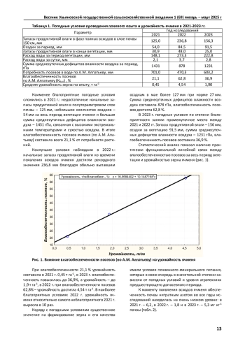 Установление причинно-следственных связей между гидротермическими условиями среды и продуктивностью зерновых культур - одно из важнейших условий повышения эффективности агротехнологических приёмов. Основным фактором реализации потенциальной продуктивности ячменя является оптимизация минерального питания, направленная на повышение урожайности в конкретных почвенно-климатических условиях. Целью исследования является определение потенциальных возможностей получения урожайности ярового ячменя при влиянии гидротермического стресса в сопряжении с пролонгированным действием минеральных удобрений в шестипольных сидеральных севооборотах в условиях степной зоны Южного Урала. Исследования проводились в центральной зоне Оренбургской области (координаты стационарного опыта 51.775125° с. ш., 55.306547° в. д.). Почвы - чернозёмы южные карбонатные среднемощные тяжелосуглинистые с содержанием гумуса 3,2…4,0 %. В среднем за 31 год исследований (1993-2023гг.) урожайность ячменя в сидеральном севообороте с кукурузой на силос при использовании минеральных удобрений составила 1,65 т, без удобрений - 1,43 т с 1 га. В очень засушливые годы отмечается заметное снижение урожайности ячменя в сравнении со среднемноголетними данными и составило 0,46 т в севообороте с кукурузой на силос, 0,42 т - с просом, 0,40 т - с сорго на силос, 0,37 т с 1 га - с горохом. Применение минеральных удобрений в очень засушливые годы приводит к снижению урожайности ячменя. В результате статистической обработки данных установлена корреляционная зависимость между урожайностью ячменя и показателем ГТК, r = 0,42.0,57.