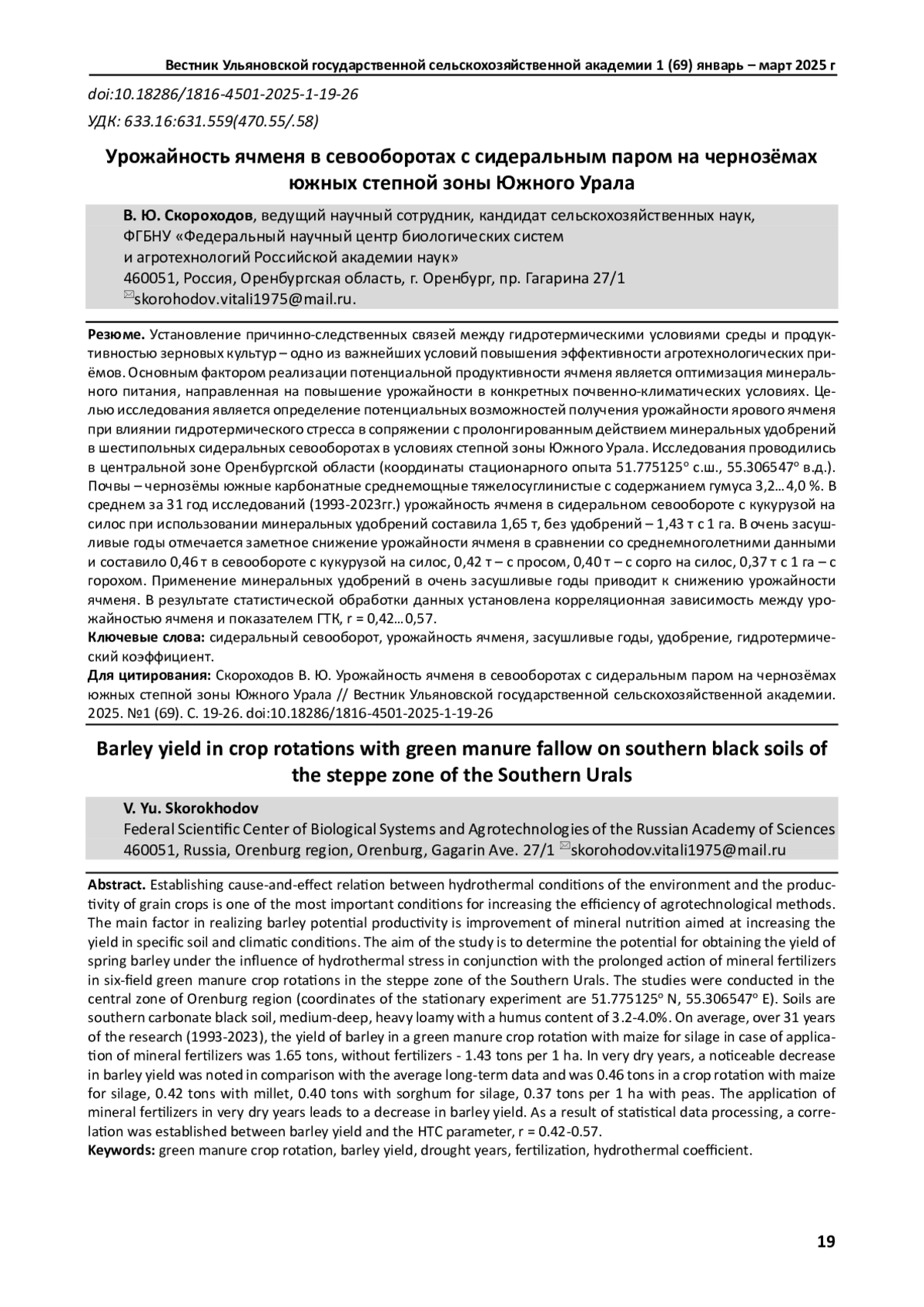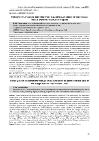 8. Скороходов В. Ю. Урожайность ячменя в шестипольных севооборотах на чернозёмах южных степной зоны Южного Урала // Известия Оренбургского государственного аграрного университета. 2019. №5 (79). С. 93-97. EDN: FUYDOV