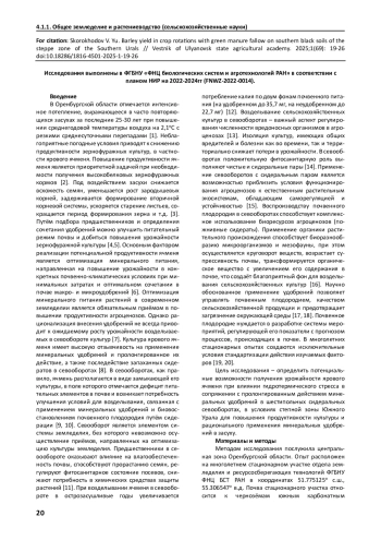 7. Артемьев А. А., Гурьянов А. М. Эффективность технологий применения минеральных удобрений при возделывании ярового ячменя в лесостепи Среднего Поволжья //Аграрная наука Евро-Северо-Востока. 2023. 24(4). 636-645. DOI: 10.30766/2072-9081.2023.24.4.636-645 EDN: CPTTOK