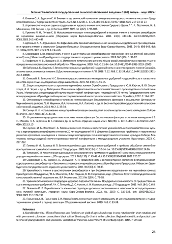 16. Сорокин И. Б., Валетова Е. А. Влияние внесения соломы и сидерата на урожайность сельскохозяйственных культур в зернопаровом севообороте в течении 20 лет исследований // В сборнике: Современные проблемы и перспективы развития агрохимии, земледелия и смежных наук о плодородии почв и продуктивности полевых культур в Сибири. Материалы международной научно-производственной конференции с международным участием. Красноярск, 2023. С. 287-292. EDN: QSYUHG