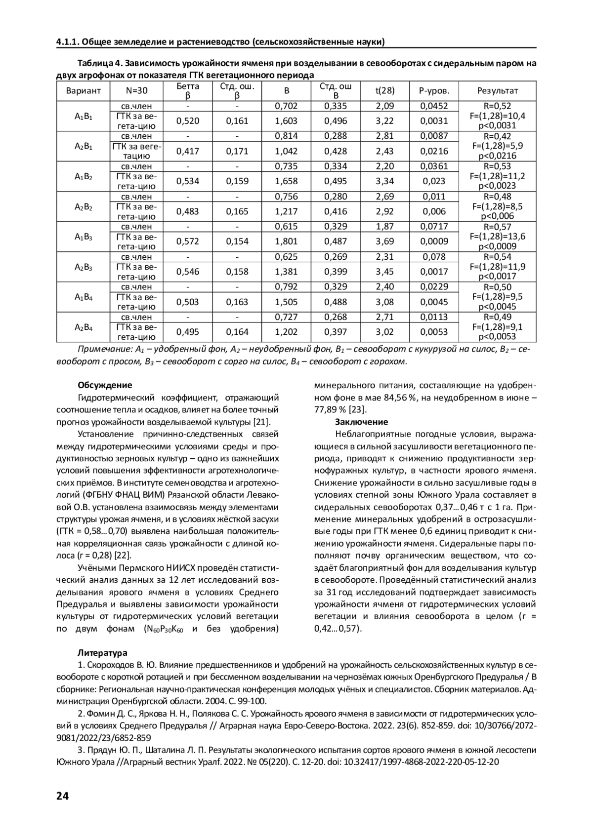 2. Фомин Д. С., Яркова Н. Н., Полякова С. С. Урожайность ярового ячменя в зависимости от гидротермических условий в условиях Среднего Предуралья // Аграрная наука Евро-Северо-Востока. 2022. 23(6). 852-859. doi: 10/30766/2072-9081/2022/23/6852-859. EDN: NWXTXV