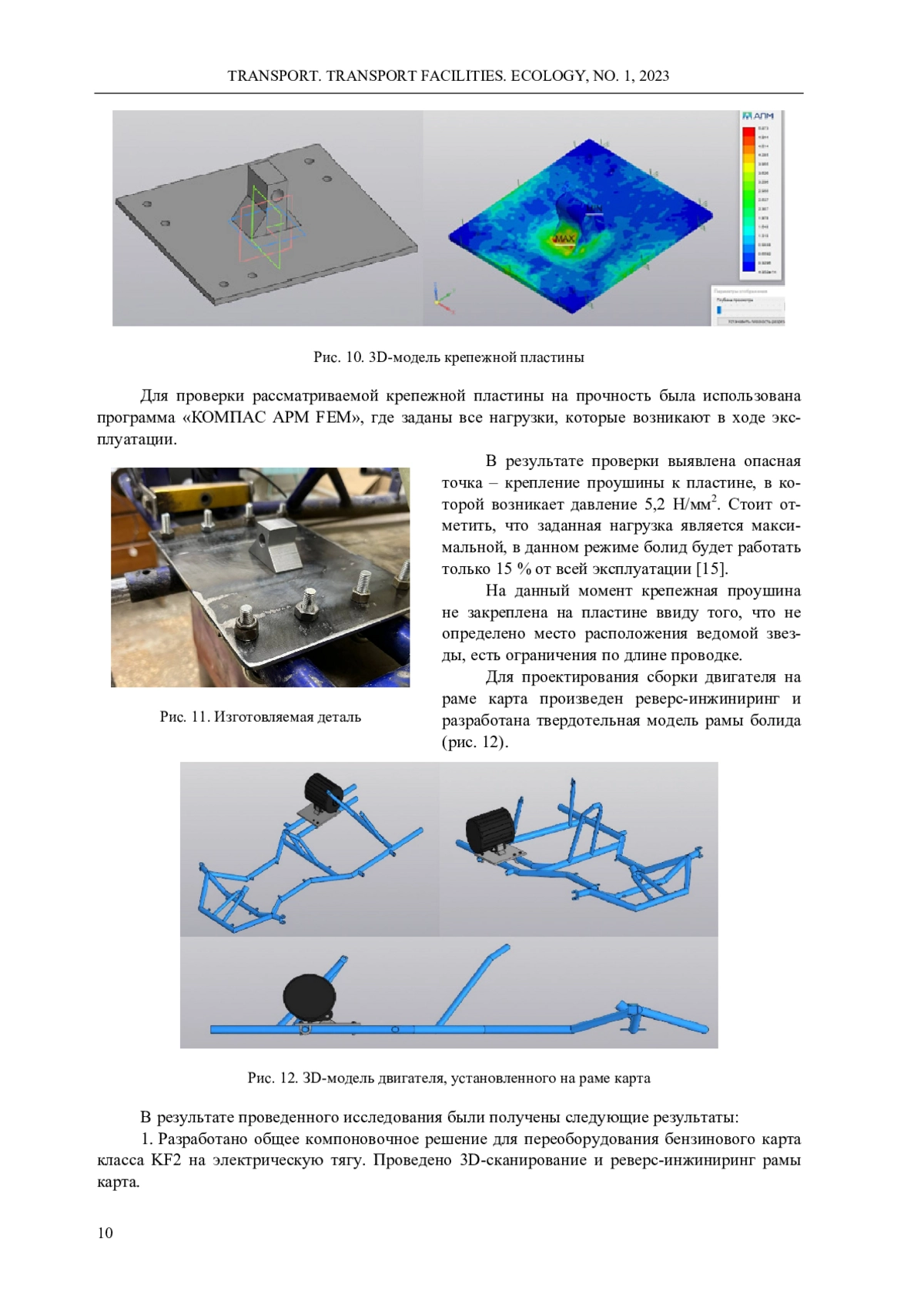 Тенденции развития автомобильного транспорта - переход к снижению углеродного следа. Применение электрической силовой установки является наиболее перспективным для решения поставленной задачи. Не исключение в данном случае спортивные автомобили, в том числе картинг. Проведен анализ актуальности электрокартинга на сегодняшний день, определены преимущества над традиционным картом с двигателем внутреннего сгорания, рассмотрено, в каких сферах применяется электрокартинг, а также осуществлено исследование международной классификации картингов, где определено, в каком классе лучше всего принимать участие. Рассмотрены основные производители спортивных электрокартингов в мире, изучены особенности их конструкции, исследовано расположение силовой установки и построение рамы. Определены пути перевода традиционного карта с двигателем внутреннего сгорания на электрическую тягу. Выбрана электрическая силовая установка, которая будет устанавливаться на место традиционного двигателя. Было сделано 3D-сканирование из облака точек для дальнейшего реверс инжиниринга и построение твердотельной модели, рассчитаны и разработаны основные узлы для установки электрического мотора на раму карта класса KF2. По полученным расчетам была построена твердотельная модель, которая устанавливается на раму болида без изменения конструкции для сохранения её прочностных свойств. Для проверки расчетов и твердотельной модели выбрана программа «КОМПАС APM FEM», где были заданы нагрузки на твердотельную модель. Проверка показала, что твердотельная модель может использоваться на данном болиде без внесения изменения в конструкцию рамы. Построена твердотельная модель болида, на которой расположен электродвигатель.