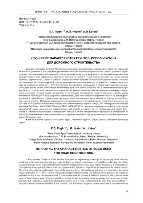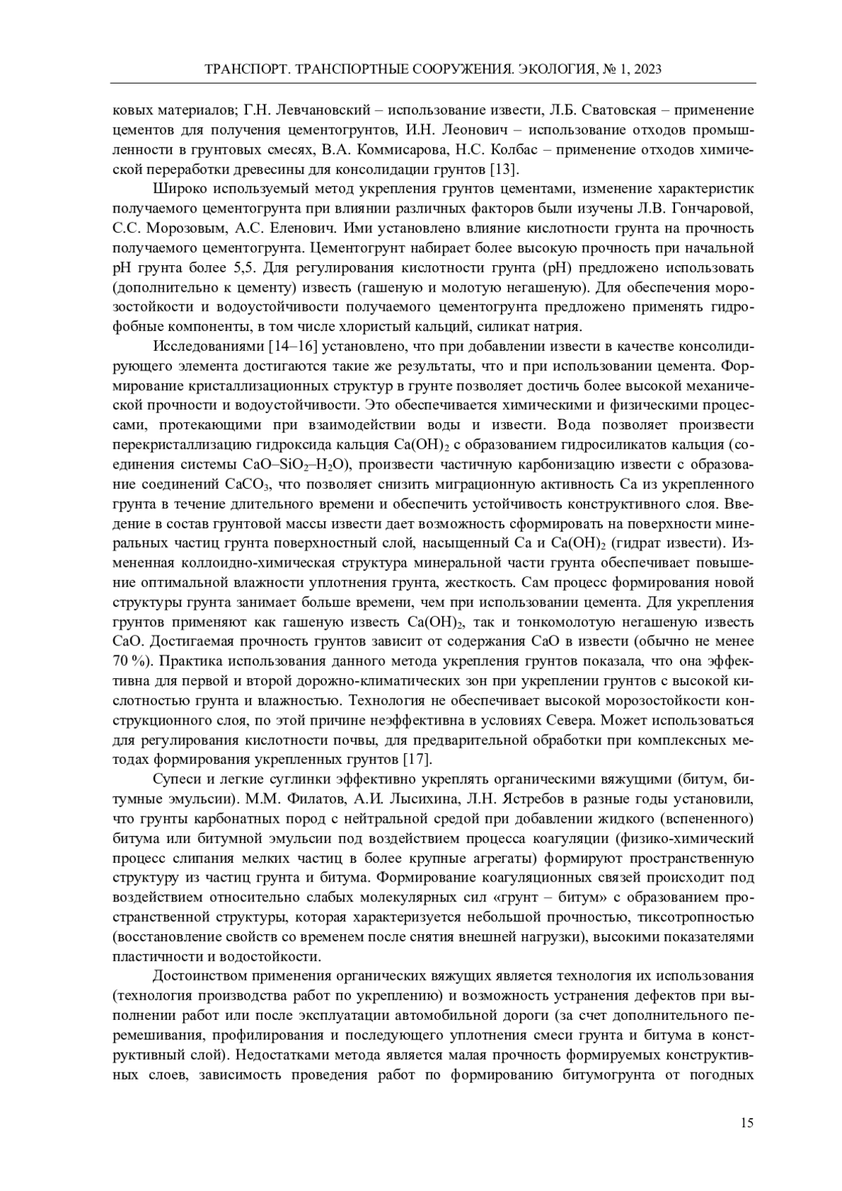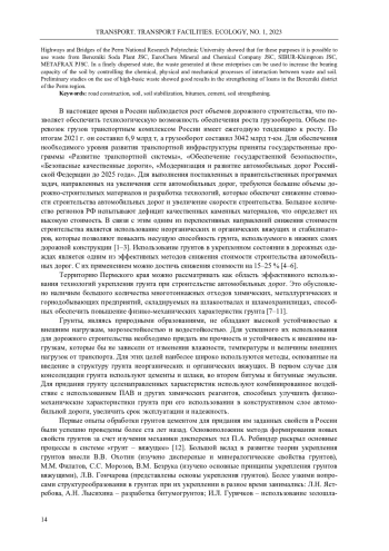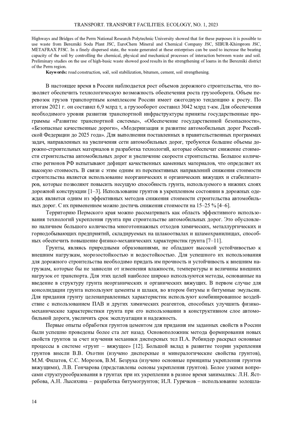 Большое количество регионов РФ испытывают дефицит качественных каменных материалов, что определяет их высокую стоимость и, как следствие, увеличение стоимости дорожного строительства. Снизить стоимость строительства конструктивных слоев дорожной одежды автомобильных дорог возможно за счет использования в качестве конструктивного слоя укрепленных грунтов из местных материалов. Такой подход позволяет не только снизить стоимость строительства, а также и повысить эксплуатационные качества автомобильной дороги в целом. Показано, что замещение части слоев дорожной одежды укрепленными грунтами приводит к снижению стоимости строительства автомобильных дорог на 15-25 %. Рассмотрено использование минеральных и органических вяжущих для консолидации частиц грунта, особенности возникающих при этом связей. Показано, что с увеличением объемов промышленного производства, расширением номенклатуры крупнотоннажных отходов появилась возможность вовлечения различных отходов (шлаки металлургии и химического производства, золы от сжигания топлива, шламы химических производств и т. п.) в дорожное строительство, при этом возможно эффективно влиять на структурообразование в грунтобетонах. Проведенные предварительные аналитические исследования на кафедре «Автомобильные дороги и мосты» Пермского национального исследовательского политехнического университета показали, что для этих целей можно использовать отходы АО «Березниковский содовый завод», АО «Минерально-химическая компания ЕвроХим», АО «СИБУР-Химпром, ПАО «МЕТАФРАКС»: в мелкодисперсном состоянии отходы данных предприятий можно применять для повышения несущей способности грунта за счет управления химических, физических и механических процессов взаимодействия отходов и грунта. Предварительно проведенные исследования по использованию высокоосновных отходов показали хорошие результаты при укреплении суглинков Березниковского района Пермского края.