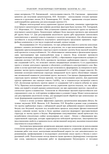 В настоящее время в России наблюдается рост объемов дорожного строительства, что позволяет обеспечить технологическую возможность обеспечения роста грузооборота. Объем перевозок грузов транспортным комплексом России имеет ежегодную тенденцию к росту. По итогам 2021 г. он составил 6,9 млрд т, а грузооборот составил 3042 млрд т-км. Для обеспечения необходимого уровня развития транспортной инфраструктуры приняты государственные программы «Развитие транспортной системы», «Обеспечение государственной безопасности», «Безопасные качественные дороги», «Модернизация и развитие автомобильных дорог Российской Федерации до 2025 года». Для выполнения поставленных в правительственных программах задач, направленных на увеличения сети автомобильных дорог, требуются большие объемы дорожно-строительных материалов и разработка технологий, которые обеспечат снижение стоимости строительства автомобильных дорог и увеличение скорости строительства. Большое количество регионов РФ испытывают дефицит качественных каменных материалов, что определяет их высокую стоимость. В связи с этим одним из перспективных направлений снижения стоимости строительства является использование неорганических и органических вяжущих и стабилизаторов, которые позволяют повысить несущую способность грунта, используемого в нижних слоях дорожной конструкции [1–3]. Использование грунтов в укрепленном состоянии в дорожных одеждах является одним из эффективных методов снижения стоимости строительства автомобильных дорог. С их применением можно достичь снижения стоимости на 15–25 %