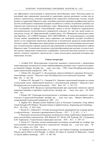 1. Агейкин В.Н. Индустриальная технология дорожного строительства с применением композиционных материалов на основе карбамидоформальдегидных смол и грунтов (на примере Западной Сибири): автореф. дис. … канд. техн. наук. - СПб.: Санкт-Петербургский архитектурно-строительный университет, 1996. - 25 с. EDN: ZJFTSN