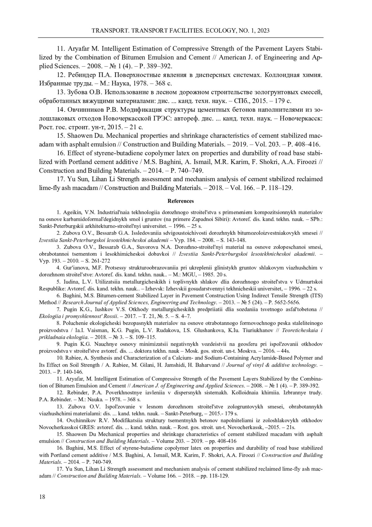 13. Зубова О.В. Использование в лесном дорожном строительстве зологрунтовых смесей, обработанных вяжущими материалами: дис.. канд. техн. наук. - СПб., 2015. - 179 с. EDN: ZPSNCV
