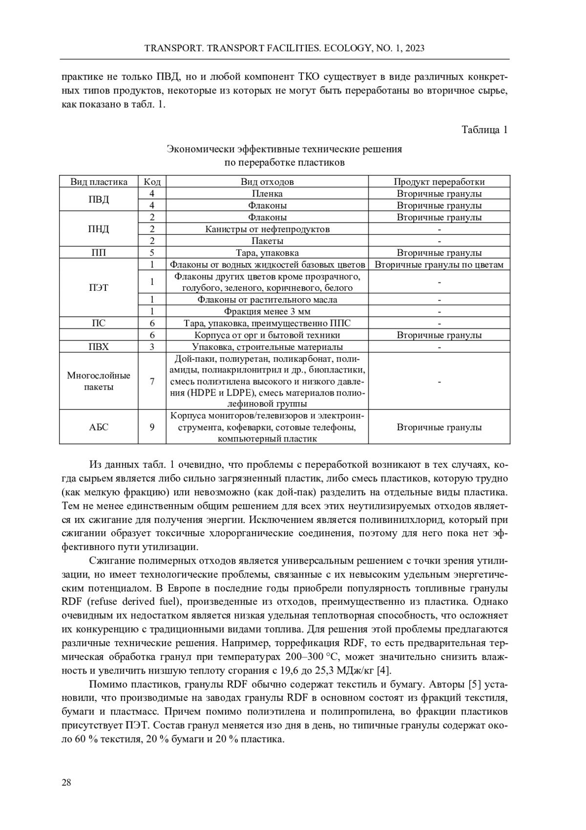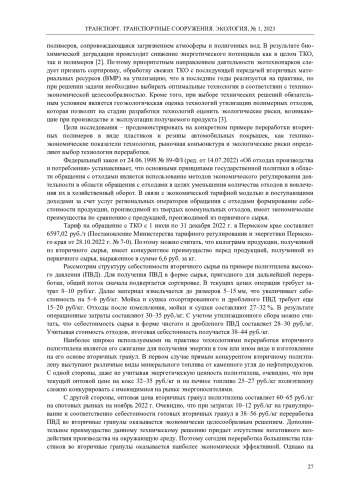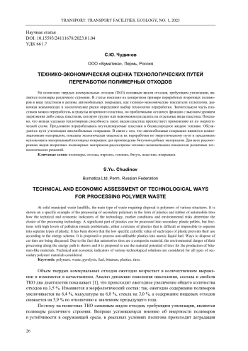 На полигонах твердых коммунальных отходов (ТКО) основным видом отходов, требующим утилизации, являются полимеры различного строения. В статье показано на конкретном примере переработки вторичных полимеров в виде пластиков и резины автомобильных покрышек, как технико-экономические показатели технологии, рыночная конъюнктура и экологические риски определяют выбор технологии переработки. Значительную часть пластиков можно переработать в гранулы вторичного пластика, но проблемными остаются фракции с высоким уровнем загрязнения либо смесь пластиков, которую трудно или невозможно разделить на отдельные виды пластика. Показано, что низкая удельная теплотворная способность таких видов пластика препятствует применению их по энергетической схеме. Предложено перерабатывать неутилизируемые пластики в бескислородное жидкое топливо. Обсуждаются пути утилизации автомобильных покрышек. В связи с тем, что автомобильные покрышки являются композиционным материалом, показана экологическая опасность их переработки по энергетическому пути и предложено использовать материальный потенциал покрышек для производства битумоподобных материалов. Для всех рассмотренных видов вторичных полимерных материалов рассмотрены технико-экономические показатели различных технологических решений.