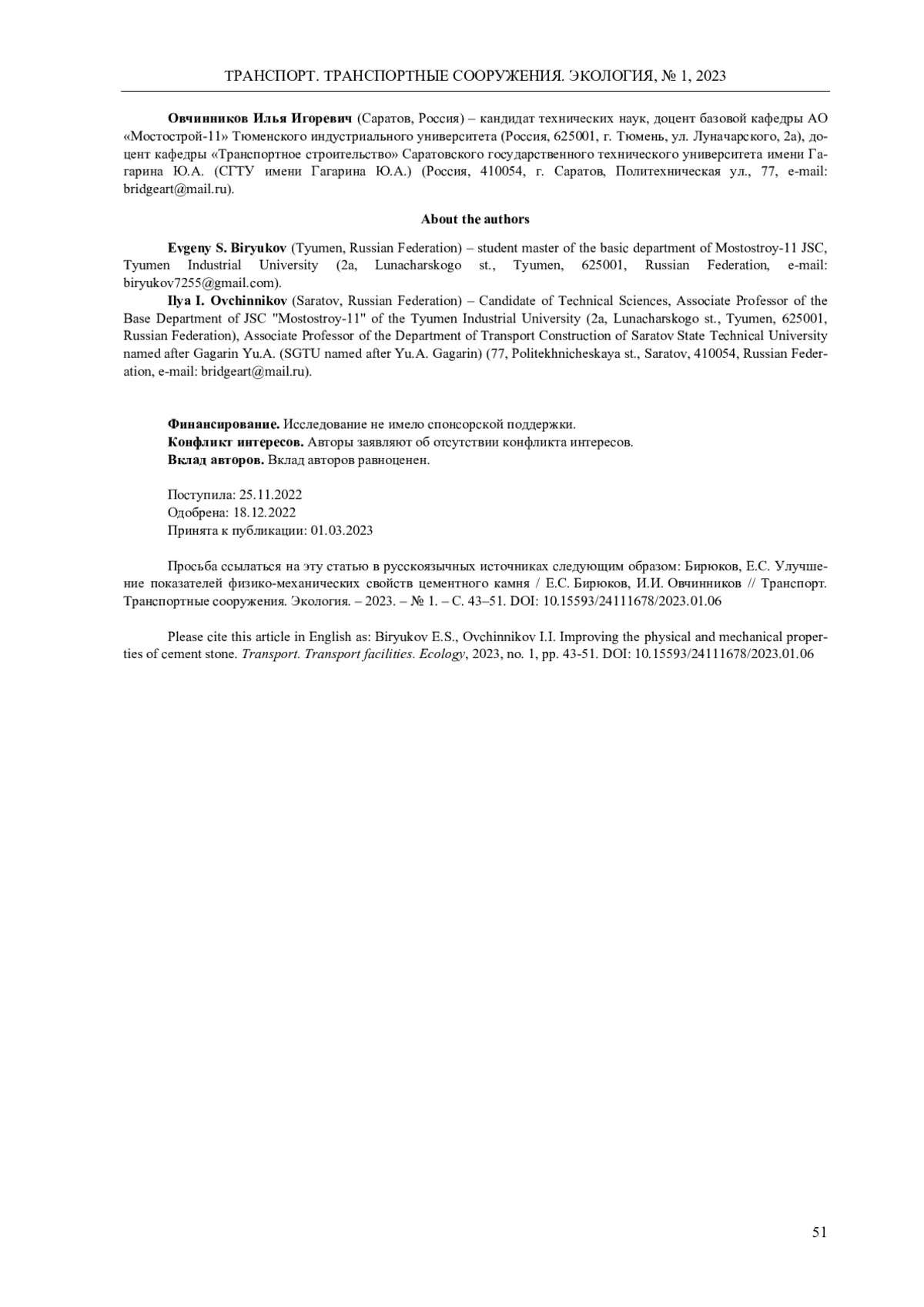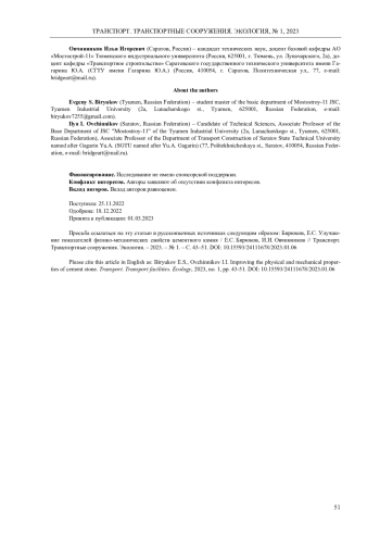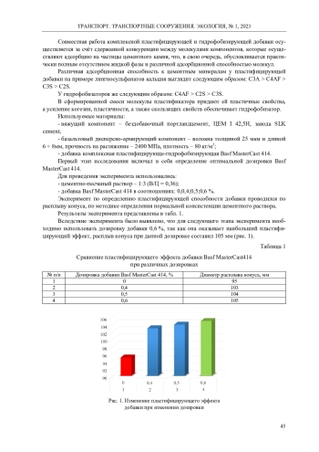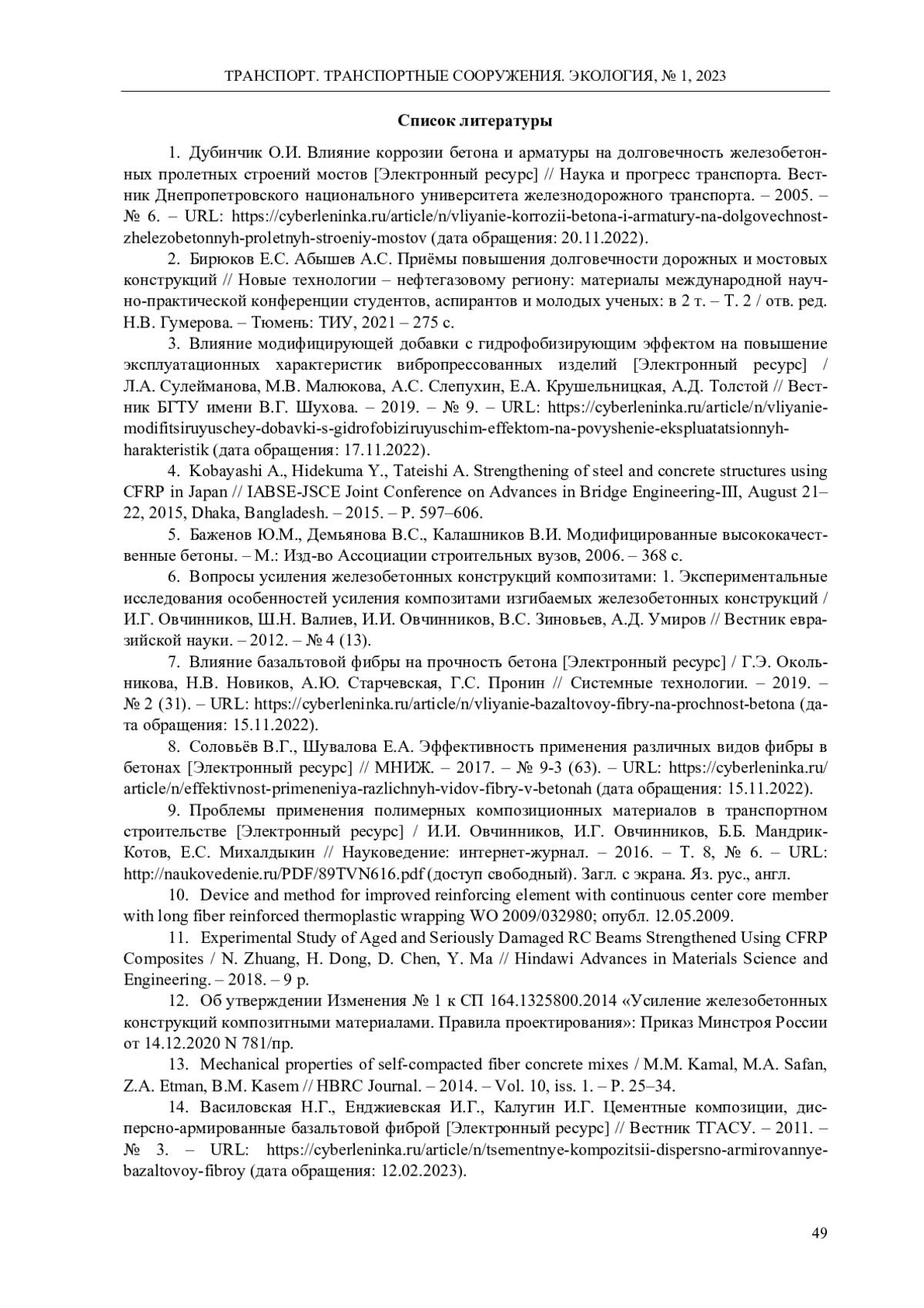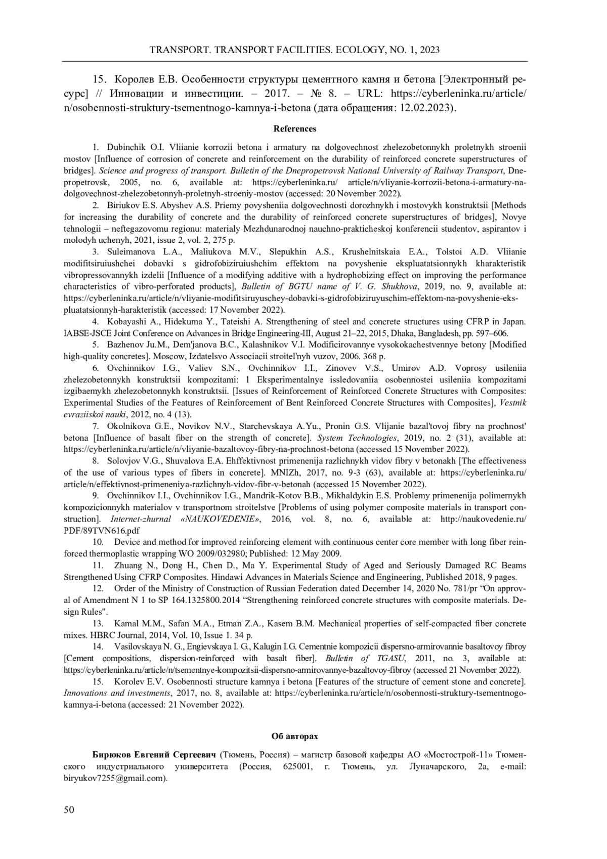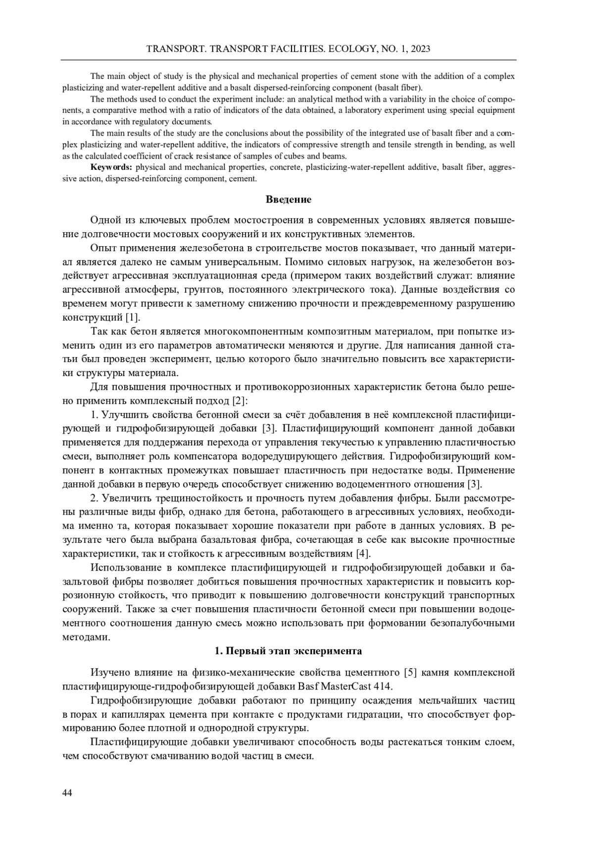 Транспортным сооружениям, в частности мостам, в связи с прогрессирующим в текущее время развитием инфраструктуры на территории Российской Федерации уделяется большое внимание. Конструкциям мостов, особенно железобетонным, приходится работать в крайне неблагоприятных условиях. В первую очередь влияют различного рода агрессивные воздействия окружающей среды (хлоридное воздействие, карбонизация, перепады температуры, воздействие микроорганизмов, противогололёдных реагентов и т. д.). Также не стоит забывать о статических и динамических нагрузках и воздействиях, оказывающих влияние на мостовые сооружения в процессе их эксплуатации, часто интенсифицирующих процесс коррозионного износа конструктивных элементов транспортных сооружений. Для решения проблемы коррозии железобетонных сооружений было решено применить комплексный подход - использовать совместно базальтовую фибру и комплексную пластифицирующе-гидрофобизирующую добавку. Целью является повышение прочностных характеристик, а также показателей долговечности железобетонных конструкций, работающих в агрессивных условиях северной части Российской Федерации. Посредством эксперимента были определены эффекты применения базальтового дисперсно-армирующего компонента совместно с комплексной пластифицирующе-гидрофобизирующей добавкой Basf MasterCast 414. В качестве основного объекта исследования выступают физико-механические показатели цементного камня с добавлением комплексной пластифицирующей и гидрофобизирующей добавки и базальтового дисперсно-армирующего компонента (базальтовой фибры). К методам, применяемым для проведения эксперимента, относятся: аналитический метод с вариативностью выбора компонентов, сравнительный метод с соотношением показателей полученных данных, лабораторный эксперимент с применением специального оборудования в соответствии с нормативными документами. Основными результатами исследования являются выводы о возможности комплексного использования базальтовой фибры и комплексной пластифицирующей и гидрофобизирующей добавки, показатели прочности на сжатие и прочности на растяжение при изгибе, а также рассчитываемый коэффициент трещиностойкости образцов кубиков и балок.