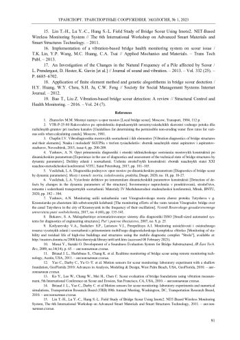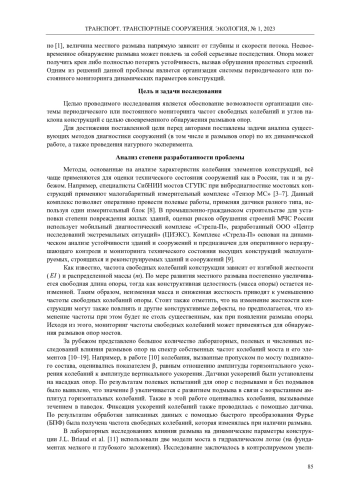 Местный размыв грунта у опор мостов является довольно распространенным и опасным дефектом, несвоевременное обнаружение которого может привести к возникновению аварийных ситуаций с тяжелыми последствиями. Обоснованы возможности организации системы мониторинга частот свободных колебаний и углов наклона конструкций с целью своевременного обнаружения размывов опор. Описан процесс образования местного размыва опор мостов, параметры, влияющие на глубину размыва. Также представлен обзор существующих методов диагностики местных размывов опор, в основе которых лежит контроль изменений динамических параметров. Описаны результаты исследований влияния других факторов (например, уровня воды, прочности грунта, места установки датчиков) на динамические параметры конструкции. По результатам анализа установлено, что для диагностики размыва опор наиболее информативными динамическим параметрами являются частоты собственных колебаний. С учетом результатов обзора существующих методов диагностики авторами проведены натурные исследования. В качестве объекта исследования были выбраны идентичные друг другу по конструкции промежуточные опоры двухпутного железнодорожного моста (одна из опор с размывом около 1,5 м, две другие опоры без размыва). Натурные измерения проведены с помощью датчиков-акселерометров и инклинометров измерительной системы «Тензор МС». Результаты натурных исследований показали высокую чувствительность измеряемых параметров (частоты свободных колебаний и наклона верха опоры) при различном уровне грунта у опоры. По результатам исследований теоретически и практически подтверждена актуальность и возможность организации системы периодического или постоянного автоматизированного мониторинга динамических параметров конструкций с целью своевременного обнаружения размывов опор.