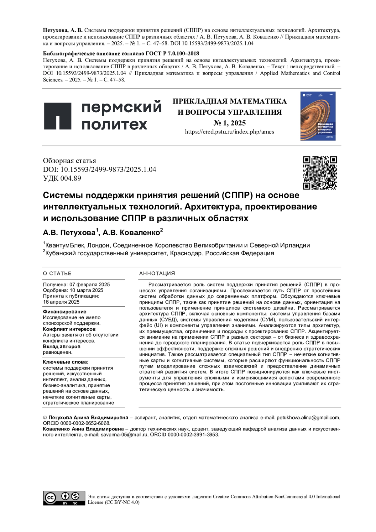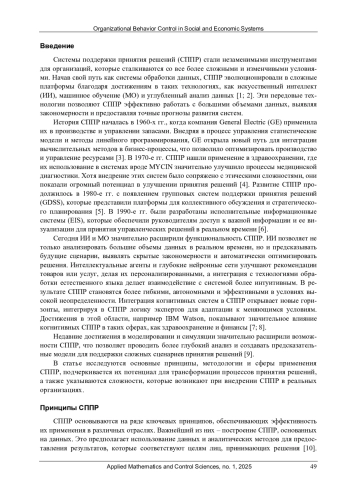Системы поддержки принятия решений (СППР) стали незаменимыми инструментами для организаций, которые сталкиваются со все более сложными и изменчивыми условиями. Начав свой путь как системы обработки данных, СППР эволюционировали в сложные платформы благодаря достижениям в таких технологиях, как искусственный интеллект (ИИ), машинное обучение (МО) и углубленный анализ данных [1; 2]. Эти передовые технологии позволяют СППР эффективно работать с большими объемами данных, выявляя закономерности и предоставляя точные прогнозы развития систем.