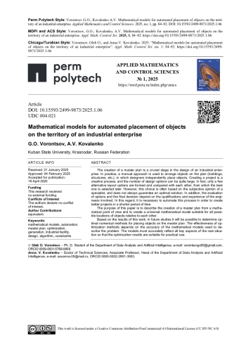 12. Коваленко, А.В. Оптимизация компоновки завода с помощью алгоритма машинного обучения / А.В. Коваленко, Г.О. Воронцов // Прикладная математика: современные проблемы математики, информатики и моделирования: мат. V Всероссийской научно-практической конференции молодых ученых, Краснодар, 11-15 апреля 2023 года. - Краснодар: ФГБУ “Российское энергетическое агентство” Минэнерго России Краснодарский ЦНТИ - филиал ФГБУ “РЭА” Минэнерго России, 2023. - С. 380-383. EDN: AJOFFY