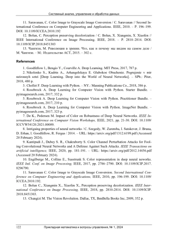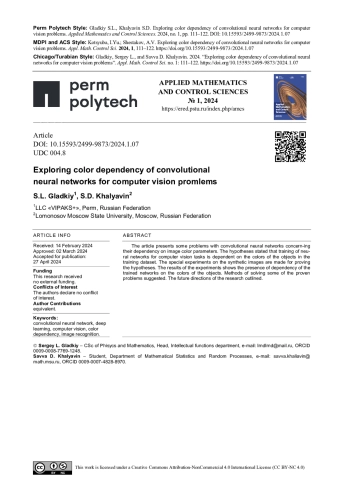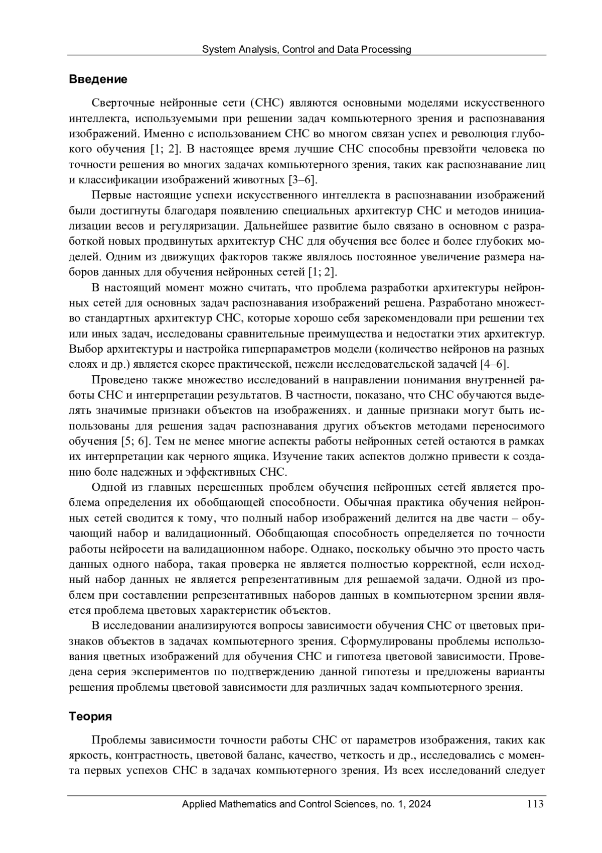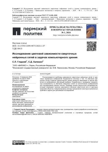 ГЛАДКИЙ С. Л., ХАЛЯВИН С. Д. ИССЛЕДОВАНИЕ ЦВЕТОВОЙ ЗАВИСИМОСТИ СВЕРТОЧНЫХ НЕЙРОННЫХ СЕТЕЙ В ЗАДАЧАХ КОМПЬЮТЕРНОГО ЗРЕНИЯ // ПРИКЛАДНАЯ МАТЕМАТИКА И ВОПРОСЫ УПРАВЛЕНИЯ. 2024. № 1