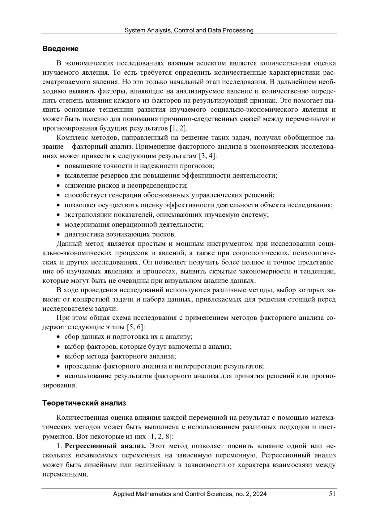 Основная задача факторного анализа - это выявление неявных факторов, объясняющих связи между наблюдаемыми переменными. Это дает возможность получить более полное и точное представление об изучаемых явлениях и процессах, что позволяет установить скрытые закономерности и тенденции, которые далеко не всегда возможно определить при визуальном анализе данных. Эти скрытые переменные могут быть использованы для упрощения данных и понимания основных механизмов, лежащих в основе изучаемого явления. Количественная оценка влияния каждой переменной на результат с помощью математических методов может быть выполнена с использованием различных подходов и инструментов. Приводится краткий обзор основного инструментария. Выбор конкретного метода зависит от характера данных, целей исследования и доступных ресурсов. Известно, что основным недостатком факторного анализа является невыполнение переместительного (коммуникативного) закона умножения, что объясняется возникновением неразложимого остатка. Неразложимый остаток объясняется тем, что рассматриваемая модель не полностью учитывает все факторы, влияющие на изучаемое явление, а поэтому вариация признака не будет определяться только рассматриваемыми факторами, то есть останется какая-то часть, не распределенная между факторами. В связи с этим величина влияния факторов на изменение результативного показателя меняется в зависимости от места, на которое поставлен тот или иной фактор в детерминированной модели. С увеличением числа факторов-сомножителей резко возрастает количество равноправных вариантов расчетов, так как увеличивается число возможных перестановок факторов. Таким образом, вариантов расчета степени влияния факторов на результирующий показатель достаточно много и выбор способа расчета зависит от целей исследования. При этом следует отметить, что количество вариантов, рассматриваемых возможных перестановок факторов можно уменьшить за счет агрегирования некоторых факторов. Важно только четко обосновать экономический смысл такого агрегированного показателя. Это обстоятельство дает возможность построения процедуры, позволяющей оценить неразложимый остаток. В статье рассматривается методика оценки неразложимого остатка. Величина неразложимого остатка может быть определена как разность данных, полученных в двух формах расчета, между значениями показателя в мультипликативной модели, где этот показатель стоит на последнем месте, и по другому способу расчета, где этот же фактор поставлен на первое место. Показано, что в ходе проведения факторного анализа имеется инвариантная константа, не зависящая от способа расчета. Приводится также способы уменьшения размерности исходной задача за счет агрегирования исходных факторов. Важно только четко обосновать экономический смысл такого агрегированного показателя. В статье приводится пример трехфакторной модели производительности труда, когда результативный показатель будет определяться тремя факторами: фондоотдачей, механовооруженностью рабочих и долей рабочих в общей численности предприятия. За счет объединения первых двух факторов в один произошла редукция задачи к двухфакторной модели производительности труда, зависящей от двух факторов: средней выработки рабочих и доли рабочих в общей чи