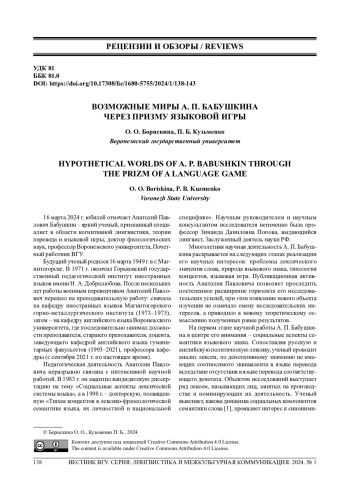 8. Кубрякова Е. С. Рец. на кн.: [Бабушкин А. П. “Возможные миры” в семантическом пространстве языка. Воронеж, 2001. 86 с.] // Вестник Воронеж. гос. ун-та. Сер.: Гуманитарные науки. 2002. № 1. С. 278-281.