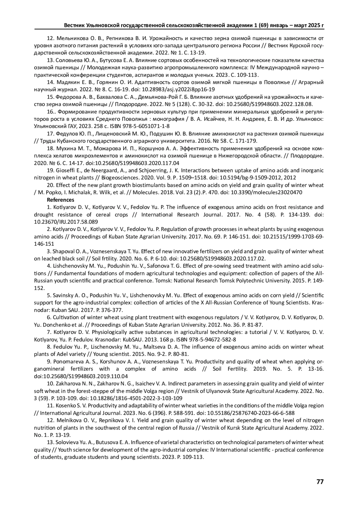 17. Федулов Ю. П., Лищеновский М. Ю., Подушин Ю. В. Влияние аминокислот на растения озимой пшеницы // Труды Кубанского государственного аграрного университета. 2016. № 58. С. 171-179. EDN: WHWKAN