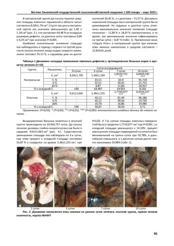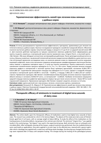 В статье рассматривается терапевтическая эффективность препаратов, применяемых для лечения язв пяточного мякиша у дойных коров. Научные исследования проводили в хозяйстве Самарской области. Объектом изучения выступали дойные коровы голштинской породы в возрасте от 3 до 8 лет со средней массой около 600 кг. Для изучения действия препаратов на процесс заживления язвенных дефектов были сформированы две группы по десять животных, в контрольной группе местно применяли мазь «Ungula Vita+)», в опытной группе -«Вет-Копем». Обе мази обладают антисептико-антимикробным действием. После ортопедической расчистки копытец у больных животных с выявленной патологией выполняли хирургическую обработку, далее местно в качестве аппликаций применяли исследуемые мази, их наносили ровным слоем на пораженный участок закрывали марлевой салфеткой, после этого выполняли перевязку ветеринарным самофиксирующим эластичным бинтом, смену повязки и перевязки повторяли через 3…4 суток до полного заживления. Оценку изменений в течение заживления патологического процесса проводили на 1-е, 3-е, 7-е, 10-е сутки. Перед началом лечения площадь язвенного дефекта в контрольной и опытной группах была примерно одинаковой, составляла 8,38±1,795 и 9,61±1,665 см2. Существенное уменьшение площади язв наблюдали на 3-е сутки, процент к исходной площади составлял в контрольной группе 64,48 % и опытной - 55,69 %, а площадь 5,40±1,18 и 5,46±1,255 см2 соответственно. Применение препарата «Вет-Копем» способствовало более быстрому лечению язвенных поражений в области мякиша и составила 10,9±0,737 сутки, а в контрольной - 12,8±0,61. Наиболее интенсивное сокращение средней площади язвенных дефектов происходило в первые три дня после начала лечения - более 40 % от всей пораженной поверхности. Применение препарата «Вет-Копем» позволит сократить лечение на 1,9 суток.