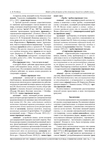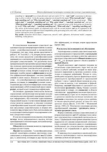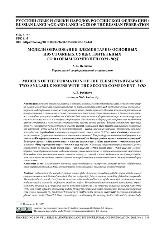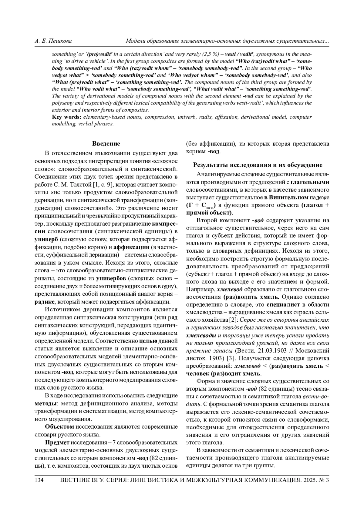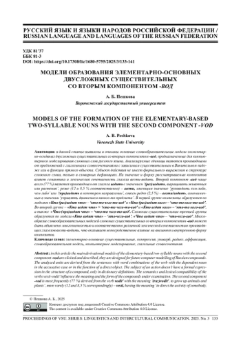В данной статье выявлены и описаны основные словообразовательные модели элементарно-основных двусложных существительных со вторым компонентом -вод, предназначенные для компьютерного моделирования сложных слов русского языка. Анализируемые единицы являются производными от предложений с глагольными словосочетаниями с зависимым существительным в Винительном падеже или в функции прямого объекта. Субъект действия не имеет формального выражения в структуре сложного слова, только в словарных дефинициях. На значение и форму рассматриваемых композитов влияет семантика и лексическая сочетаемость глагола вести-водить. Второй компонент -вод чаще всего (77 %) является производным от глагола водить с значением ‘(раз)водить, выращивать животных или растения’, реже (12 и 8,5 % соответственно) - вести, имеющим значение ‘руководить кем-либо, чем-либо ’или ‘(про)водить в некотором направлении ’, совсем редко (2,5 %) - вести/водить, синонимичных в значении ‘управлять движением какого-то предмета ’. В первой группе композиты образуются по моделям «Кто (раз)водит что» - ‘кто-то чего-то-вод’ и «Кто (раз)водит кого» - ‘кто-то кого-то-вод’. Во второй группе - «Кто ведет что» > ‘кто-то чего-то-вод ’ и «Кто ведет кого» - ‘кто-то кого-вод ’, а также «Что (про)водит что» - ‘что-то чего-то-вод’. Сложные существительные третьей группы образуются по модели «Кто водит что» - ‘кто-чего-вод’, «Что водит что» - ‘что-чего-вод’. Многообразие словообразовательных моделей сложных существительных со вторым компонентом -вод может быть объяснено многозначностью и соответственно различной лексической сочетаемостью производящих глаголов вести-водить, что оказывает непосредственное влияние на внешнюю и внутреннюю форму композитов.