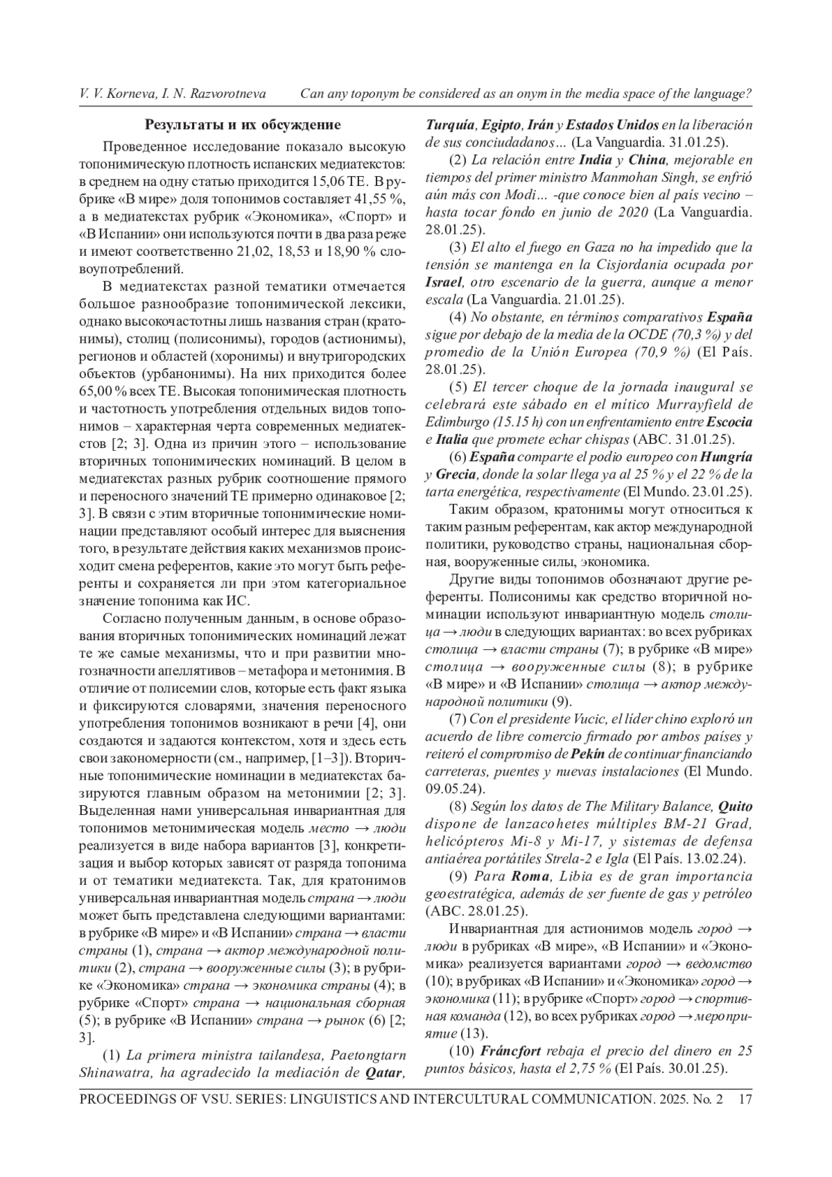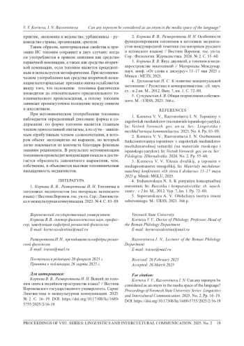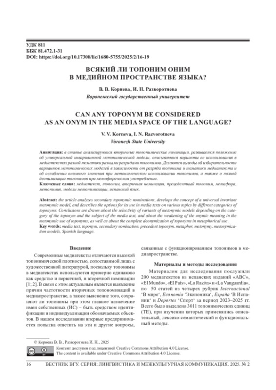 1. Корнева В. В., Разворотнева И. Н. Топонимы в заголовках медиатекстов (на материале испанского языка) // Вестник Воронеж. гос. ун-та. Сер.: Лингвистика и межкультурная коммуникация. 2023. № 4. C. 83-89.