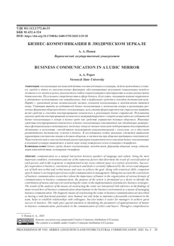 Коммуникация как взаимодействие носителей языка и культуры, будучи важнейшим условием, средой и одним из многочисленных факторов, обусловливающих результат социализации каждого человека и его жизни в целом, реализуется в любом социокультурном пространстве в самых разных видах деятельности. На успешное сотрудничество в сфере бизнеса, безусловно, оказывает влияние корректное и адекватное использование как невербальных, так и вербальных средств и способов достижения цели. Наряду с грамотной речью неотъемлемой частью успешной коммуникации в менеджменте является юмор. Учитывая выводы исследователей бизнес-коммуникации о значимости юмора в организации различных форматов общения в бизнес-коммуникации, цель статьи формулируется как стремление выявить вклад средств и способов конструирования комического в реализацию бизнес-стратегий. Результаты анализа средств конструирования комического интерпретируются с опорой на выкладки исследователей бизнес-коммуникации о юморе в бизнес-среде как средстве управления деловым общением. Языковые средства конструирования комического в бизнес-коммуникации описываются как обладающие развернутым функциональным потенциалом, поскольку юмор не только помогает поддерживать благоприятную обстановку в коллективе, способствует налаживанию взаимоотношений с коллегами, но и облегчает руководителям достижение успехов в бизнесе. В исследовании особое внимание уделяется выявлению параметров уместности юмора в деловом общении, в частности при общении продавцов и покупателей. Через комплексный и многоаспектный анализ примеров юмористического описания бизнес-коммуникации в немецкой культуре выявляется, в какой мере юмор универсален и/или культурно-специфичен.